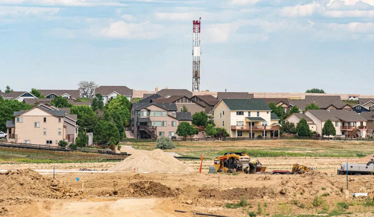 Una plataforma de perforación de petróleo y gas se eleva por encima de un vecindario del condado de Weld el 5 de junio de 2020. Foto por Andy Colwell para The Colorado Sun