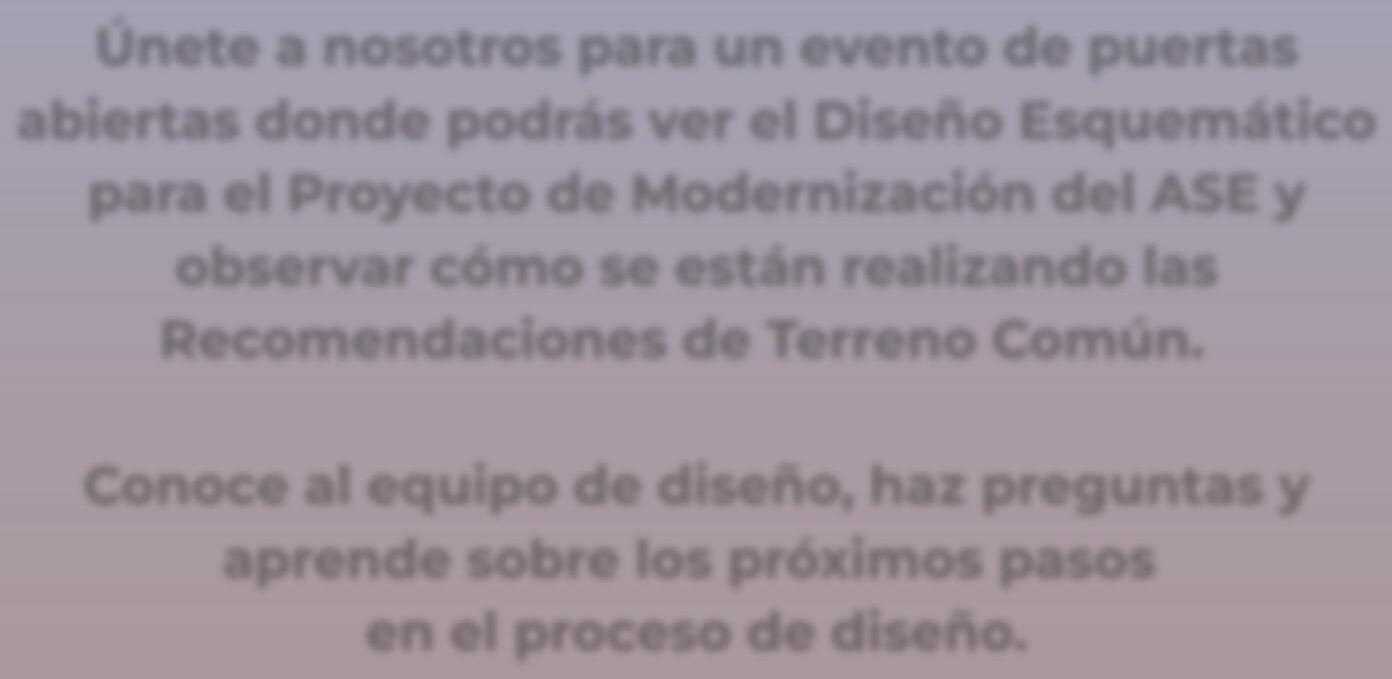 Únete a nosotros para un evento de puer tas abier tas donde podrás ver el Diseño Esquemático para el Proyecto de Modernización del ASE y obser var cómo se están realizando las Recomendaciones de Terreno Común.