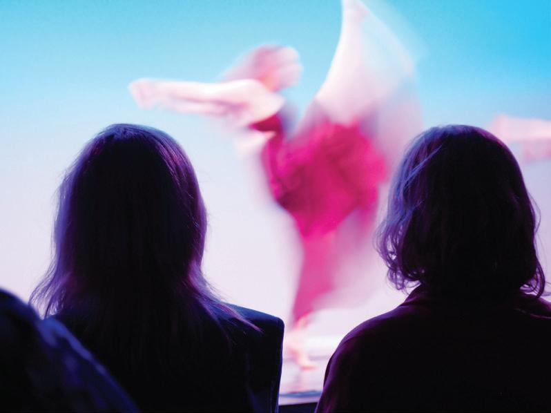 Los siete bailarines dando vida a su primer acto vestidos de colores naranjas y rodeados de sonidos naturales y su público. Foto por Raleigh Burleigh