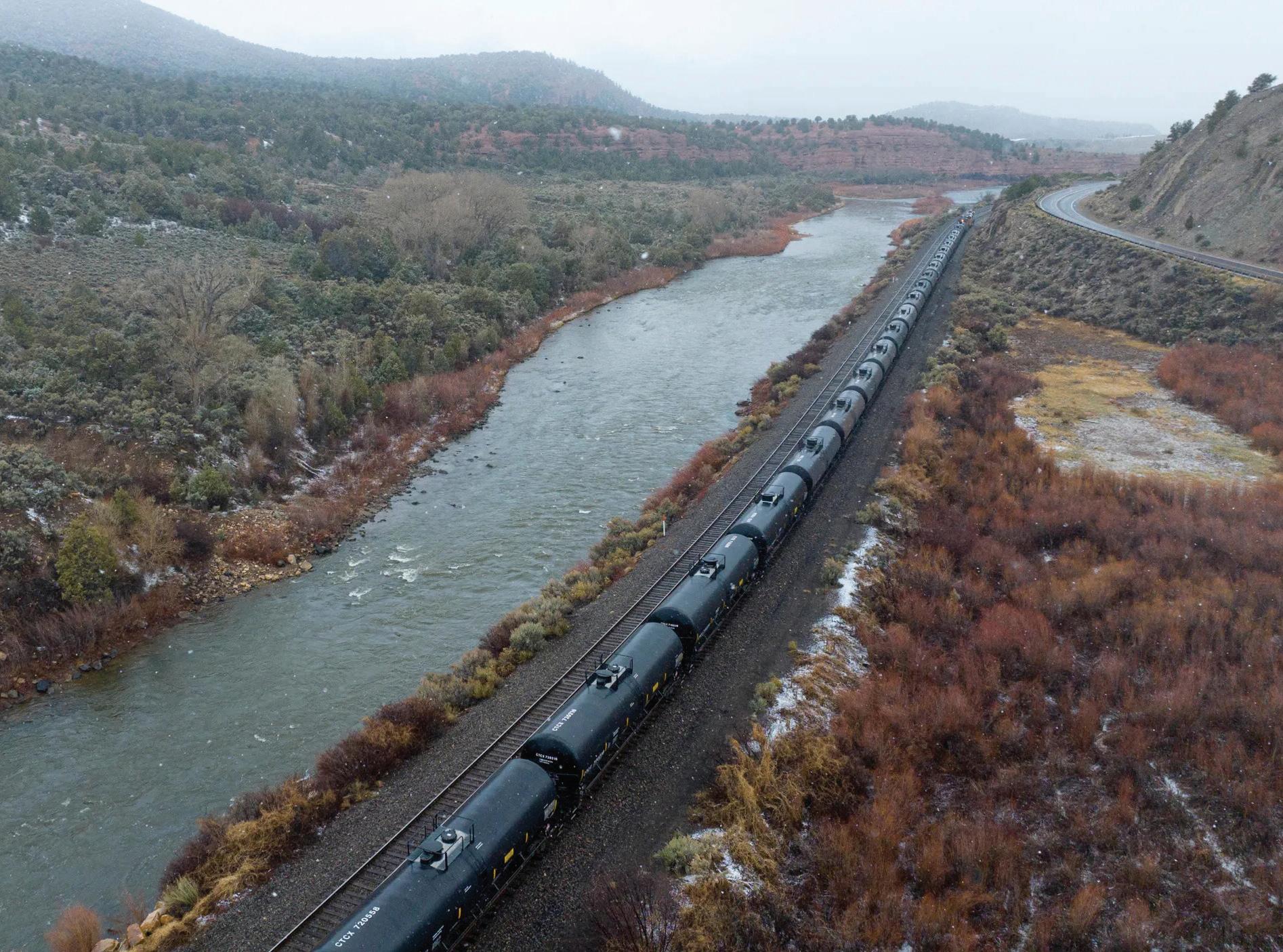 Train cars are parked along the Colorado River, April 10, 2024, in Bond. Foto por Hugh Carey para The Colorado Sun