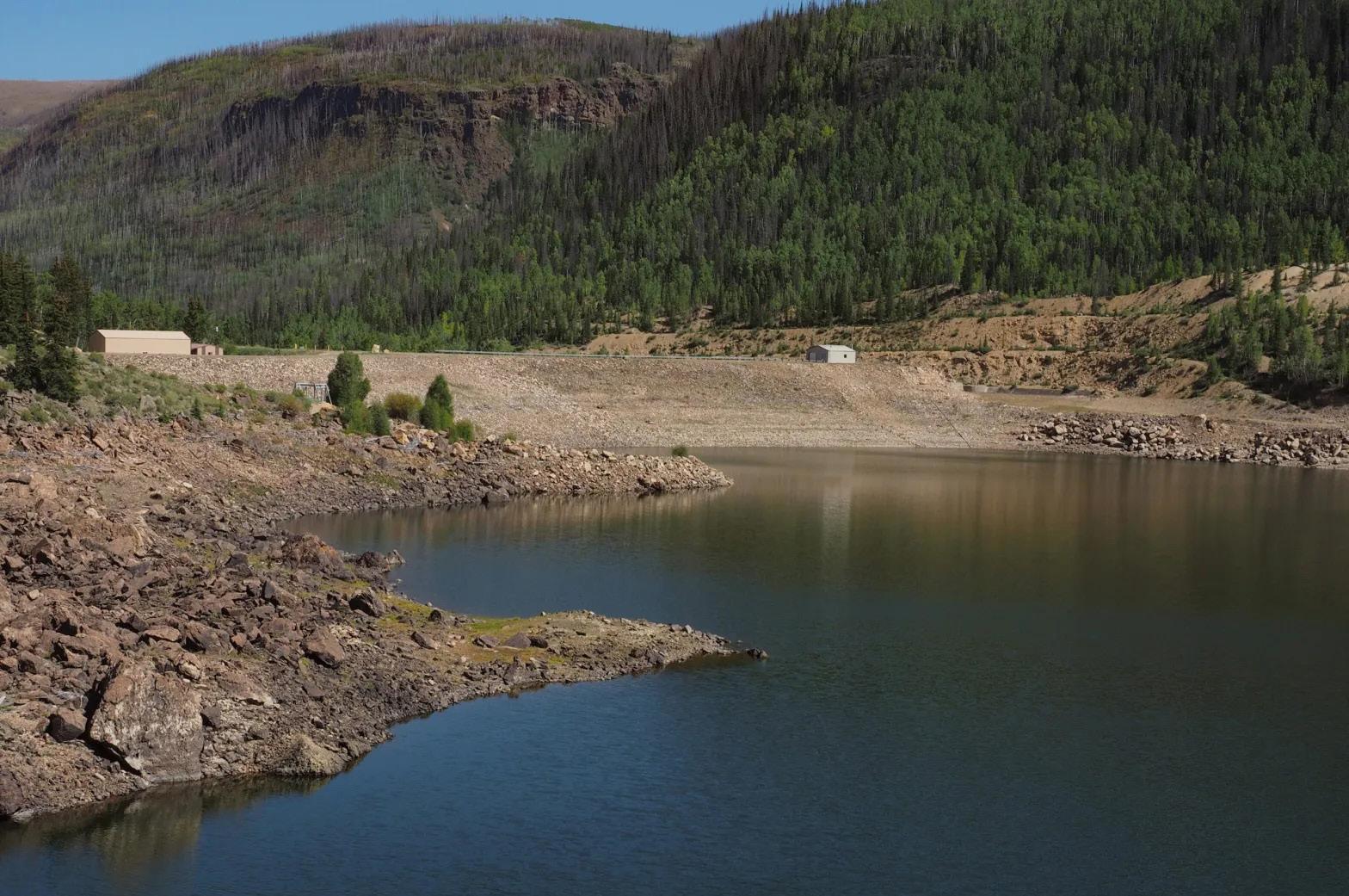 La parte frontal de la presa del Río Grande mostrando una pequeña porción del embalse del Río Grande. Finalizada en 1914 para almacenar agua para el distrito de riego del valle de San Luis, la presa Río Grande crea el tercer embalse más grande de Colorado. El embalse tiene una capacidad de 52,000 acres-pies de agua. Foto por Dean Krakel para The Colorado Sun