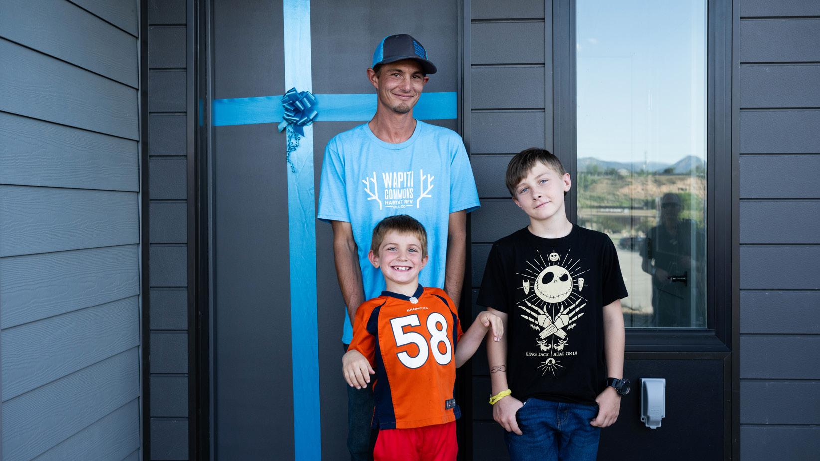 Arriba: Clay y sus dos hijos enfrente de su nueva casa en Wapiti Commons en Rifle el 29 de agosto de 2024. Los hijos de Clay compartieron que estaban muy emocionados de tener sus propias habitaciones. Foto de cortesía por Habitat RFV