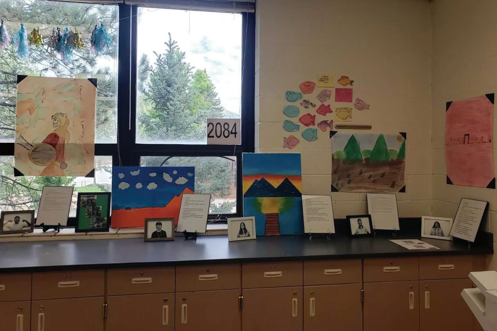 Las obras de arte de los estudiantes se exhibieron en la sala de descanso de los maestros en la high school para que así los maestros conocieran mejor a los estudiantes. Foto de cortesia de Kira Cunningham del distrito escolar de Durango para Chalkbeat Colorado