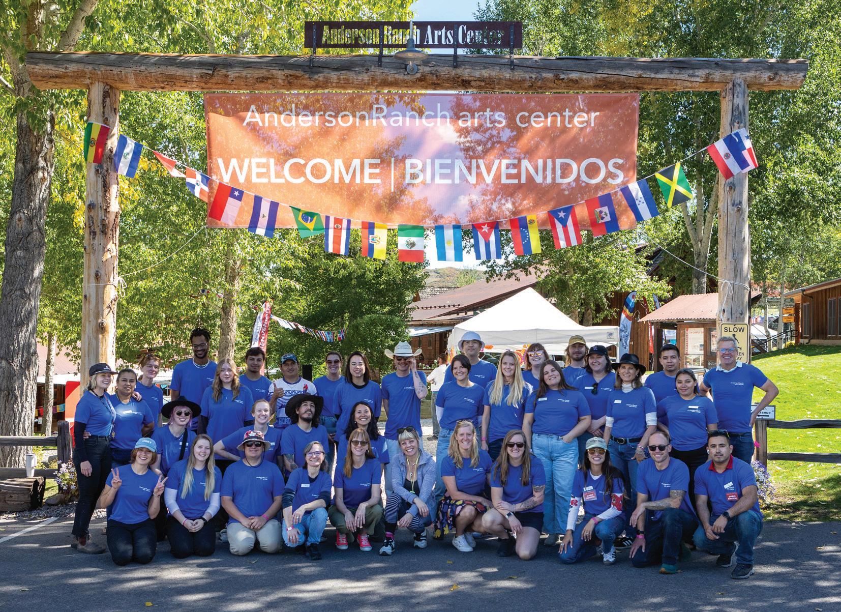 Grupo de empleados, voluntarios y miembros de la mesa directiva al frente del letrero de bienvenida del evento Festival del Rancho. Foto de cortesia por AndersonRanch Arts Center