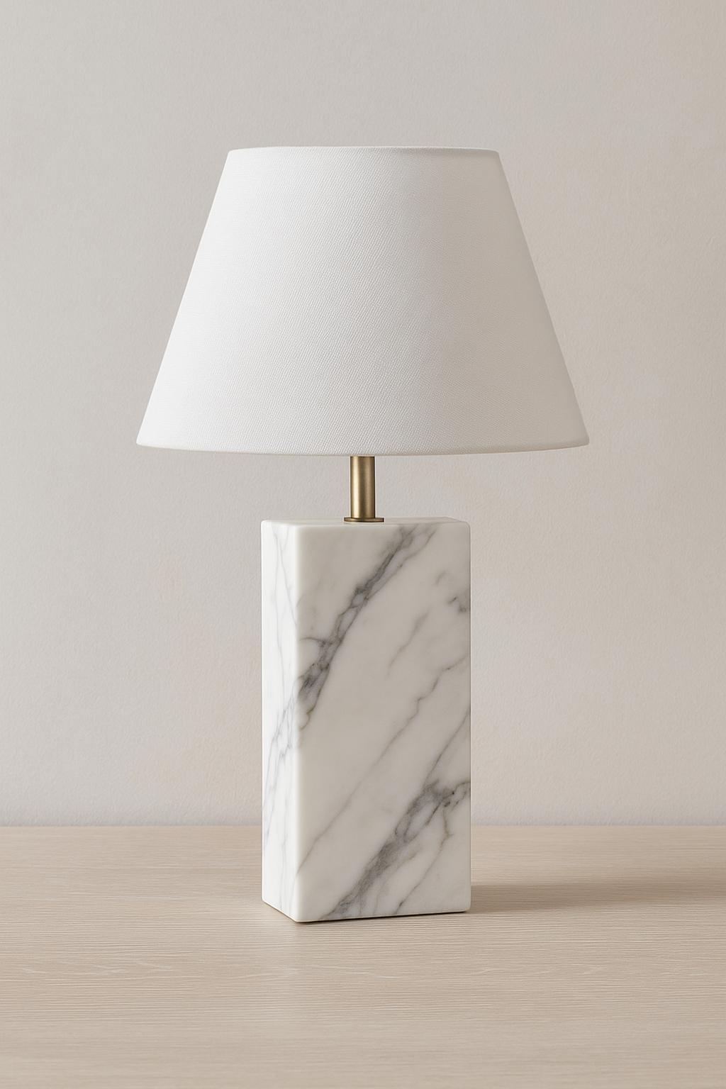 Base rectangular de mármol blanco con vetas grises. Pantalla blanca clásica.