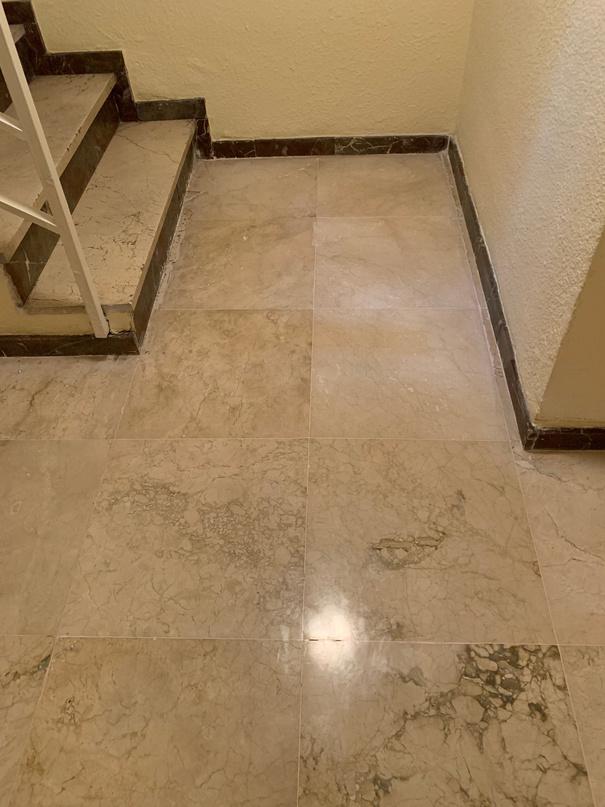 Este suelo tiene más de 40 años y sufre diariamente un importante tránsito de personas porque está situado en una comunidad de vecinos. Como se puede observar en las fotografías, el color se ha recuperado, las juntas se han limpiado y con ello desaparecido, y también se procedido a arreglar algunos desperfectos de la piedra.