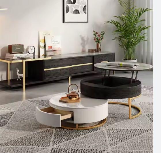 Design: Round marble top with intricate gold circular detailing Highlight: Artistic base combining elegance and texture