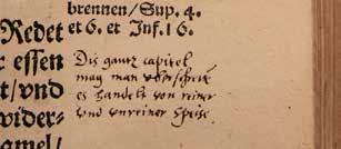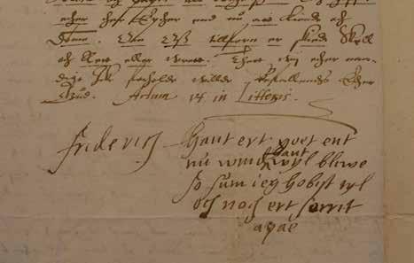 F2’s tekst med henvisninger til punkter i kapitlet ”Om F2’s sprog”: Anno 1567 hawert (8; 11) ieg (1) lest (7) denne bybel (3) gut (14) werre (7; 11; 22) lowet (11; 24) vt (14; 15) // po (9); frederssbor (18; 22; 37) den tyedt (3; 8; 23 V) der war (11) krye (3, 23 V; 28) ymellum (3; 31) danmarch (2b) och (2a) schwerrich (2a; 11; 13) // gut (14) vnde