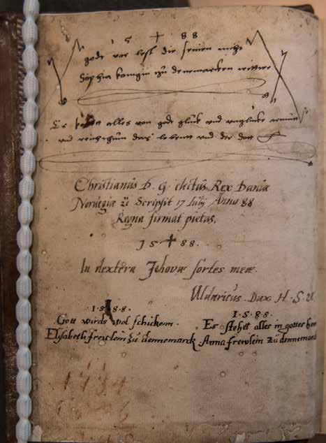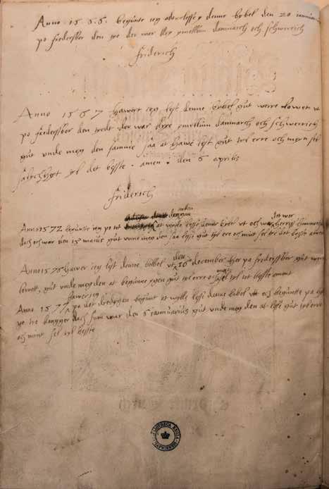 F2’s tekst: Anno 1576 hawer ieg lest denne bilbel vt den 16 december her pa frederssbor gut werre // lowett, gut vnde meg den at begunne ygen gut tyl erre och mint sel tyl tet besste ament