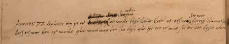 gan” alligevel være det rigtige, hvad det så heller ikke var. Til sidst er misforståelsen blevet opklaret og “drette” streget ud og erstattet af et “den gan” med den rigtige form af demonstrativpronomenet i dets funktion af bestemthedsmarkør / artikel men uden ordenstallet “anden”, der har måttet puttes på til aller sidst i toppen af tilskriftspyramiden. Glemt er det lille “tet” i forbindelsen “beguntte ieg po tet”, der vel egentlig også skulle have været streget ud, men måske i al virvarret har fået en ny funktion i sætningen som egentligt demonstrativpronomen, dvs. “År 1572 begyndte jeg på det – for anden gang – nemlig på projektet med at ville læse osv.”