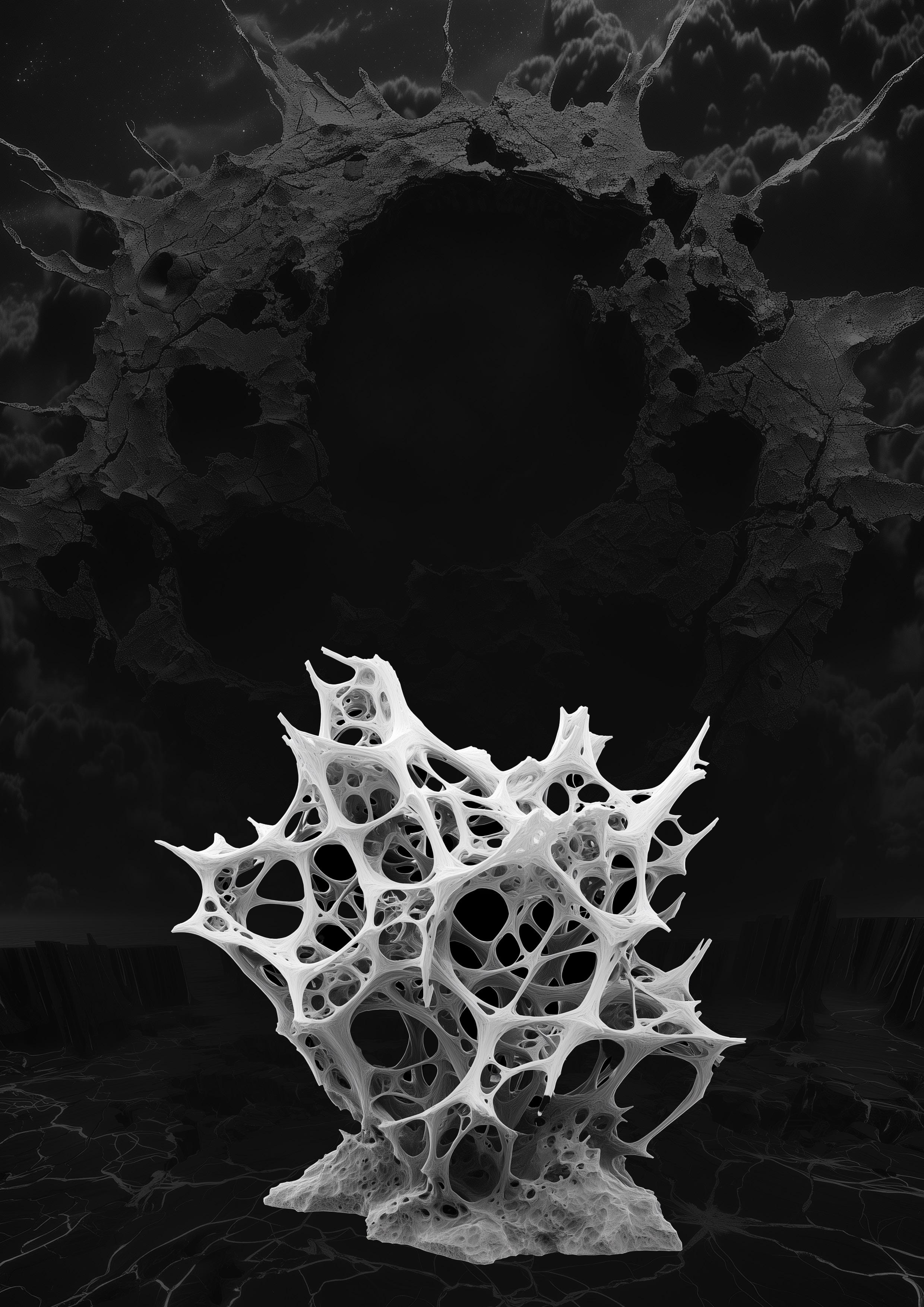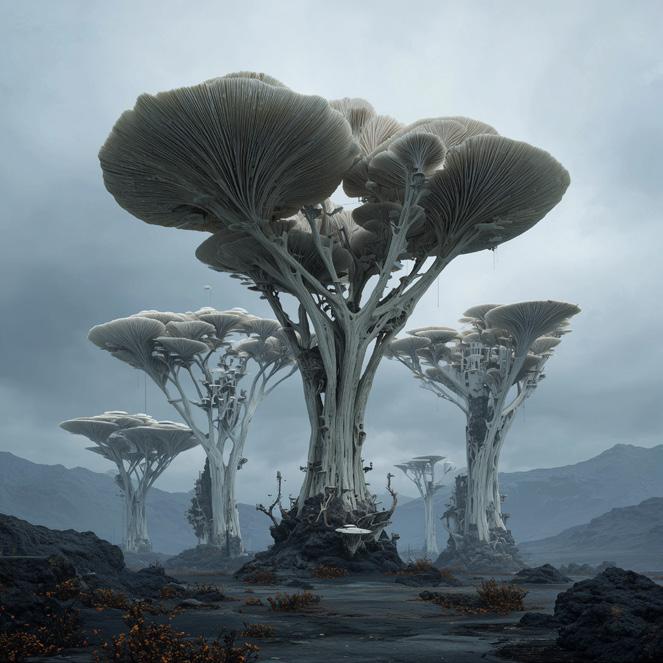 Towering up to 25 meters, these colossal fungi resemble pale stone pillars topped with umbrella-like caps. Beneath their wide overhangs, smaller organisms find shelter from wind and temperature shifts. Their root systems penetrate deep into the metallic substrata, possibly for structural support and mineral absorption.