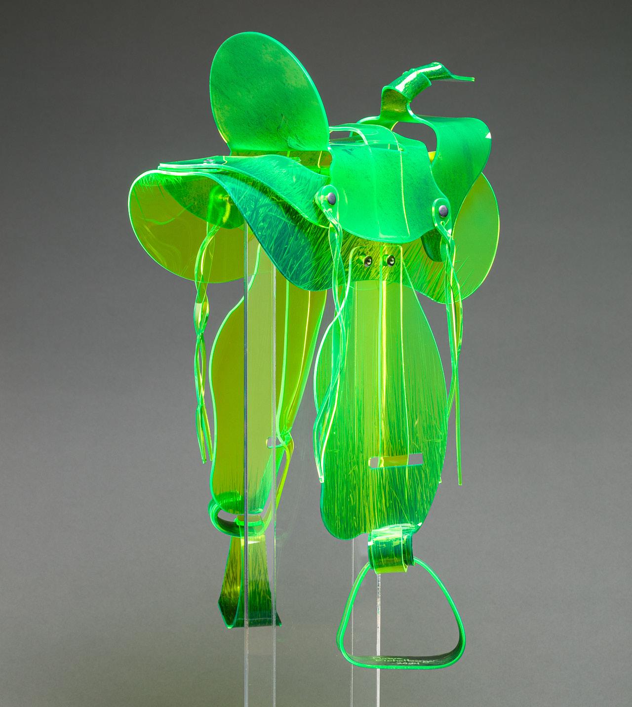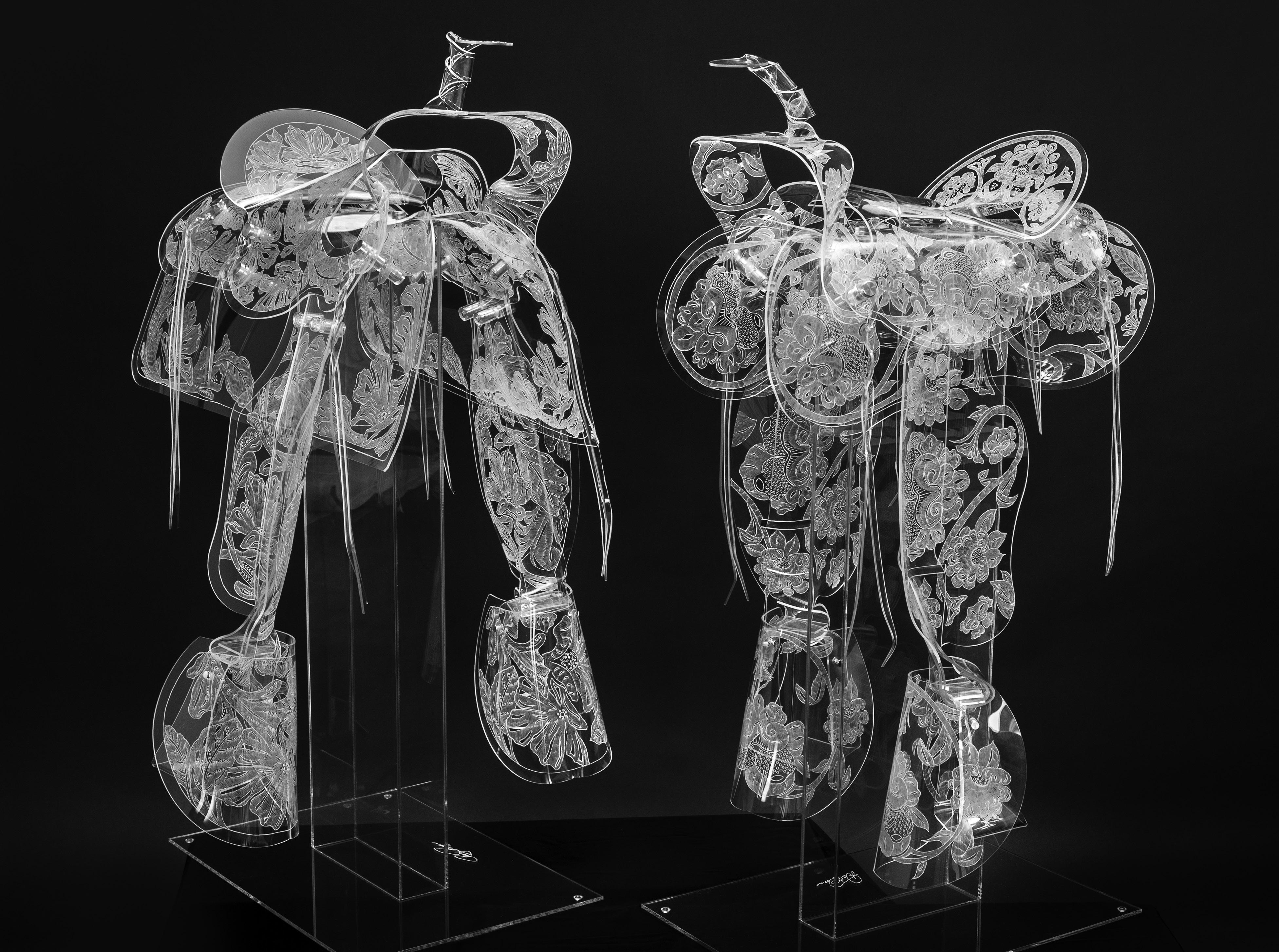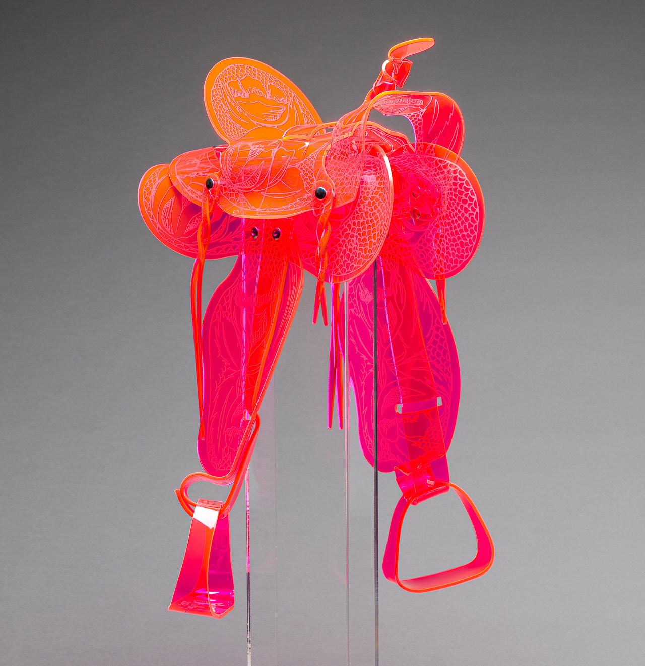 Maeve’s unique creative process begins with photographing by theme, whether man-made or natural, and then juxtaposing these images based on fundamental design elements such as line, pattern, and form. These compositions are digitally translated, printed on Plexiglass, and meticulously cut into geometric shapes before being assembled into captivating 3-D works that deconstruct traditional Western imagery.