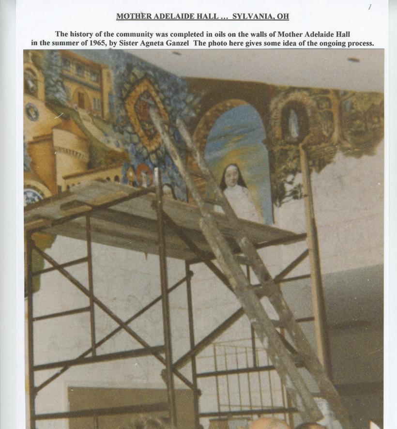 The south entrance to Lourdes University’s Appold Planetarium bears a historical mural portraying the life work of the beloved and Venerable Sylvania Franciscan Foundress, Mother M. Adelaide. The panels, designed and painted by Sister Agneta Ganzel in 1964, are oil on canvas, and tell the story of the Sisters’ history. Mother Adelaide stands quietly under one of the quintessential arches that grace the architecture here, her stance one of both peaceful serenity and quiet energy. Panels on each side depict her legacy. To her right, some of the older buildings of the Motherhouse are seen, including St. Francis, St. Anthony and Carmel Halls, the trunk house and garage, the original Chaplain’s Residence as well as the statue of Our Lady enshrined in the grotto of Lourdes on a nearby hill.