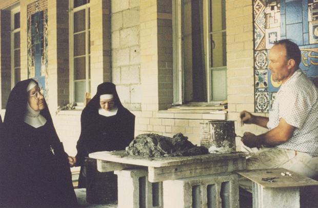 Mother Adelaide and Sister Michaeline appraise the work of mosaicist Mr. Liebermann as he works on the panel of St. James in 1959.