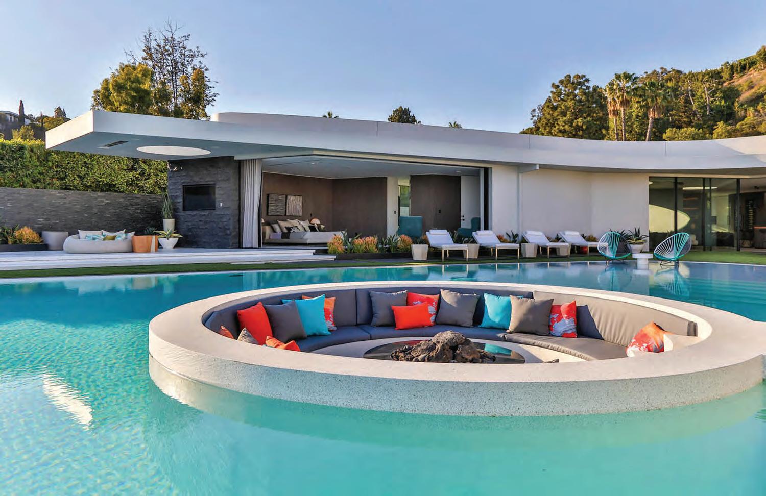 Inspired by the home’s 1960s architectural roots and the client’s passion for street art, this Beverly Hills bachelor pad balances retro influence with contemporary, indoor-outdoor living. At the heart of the outdoor space is a sculptural, circular conversation pit that functions as both a gathering place and an architectural focal point, oriented to take in hillside and city views. The curved form reflects the client’s preference for circles, creating an inviting setting for conversation, entertaining and enjoying the surrounding landscape. Photography by Berlyn Media.