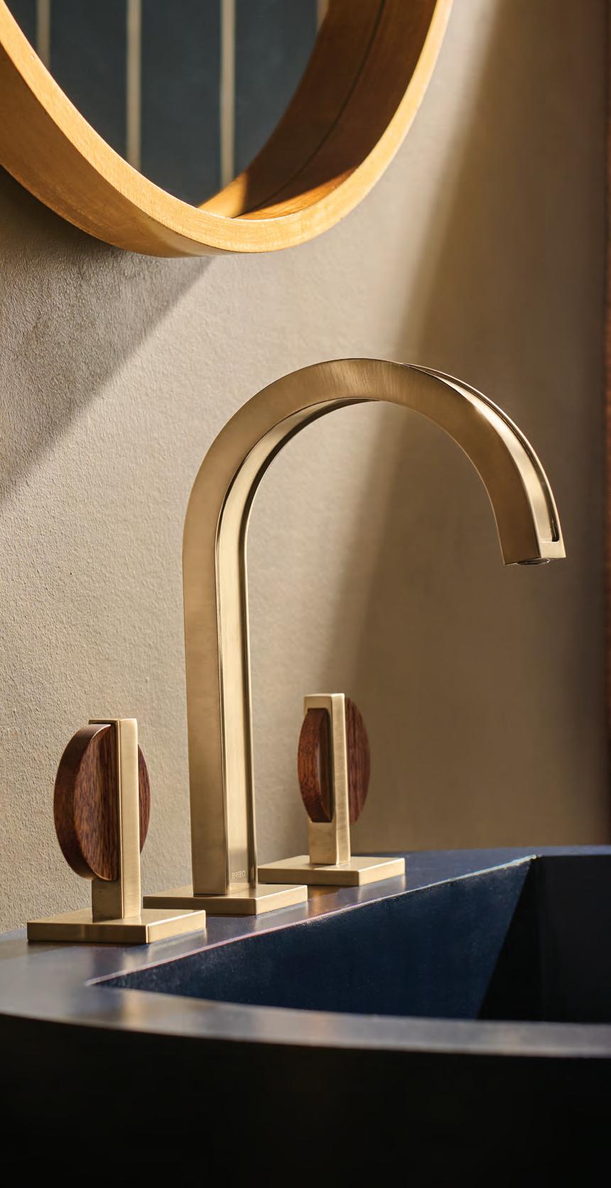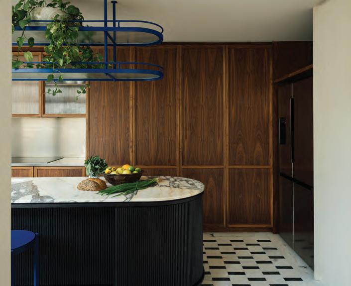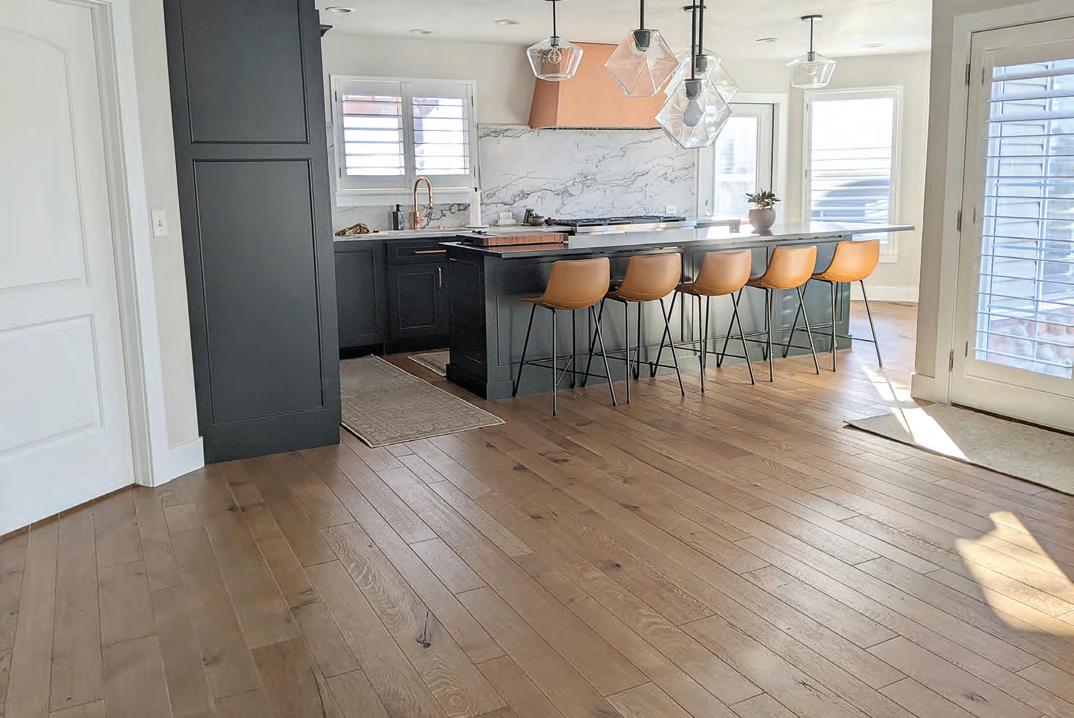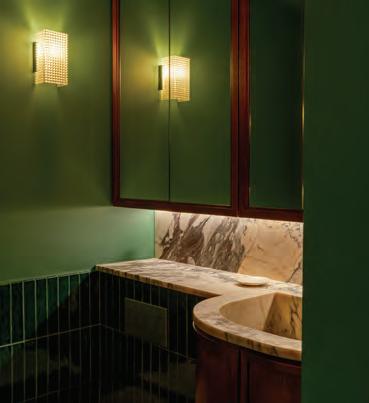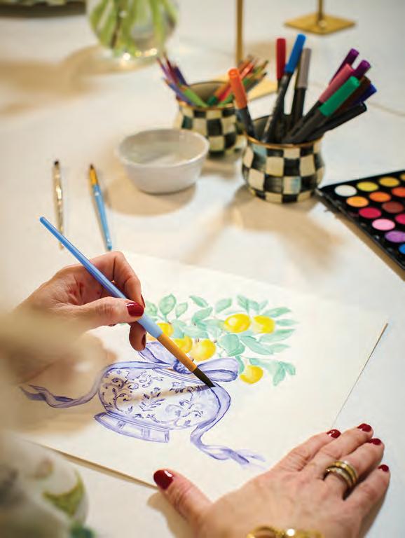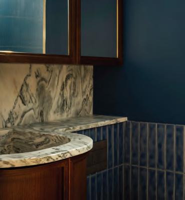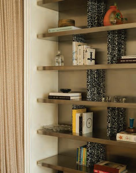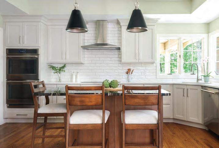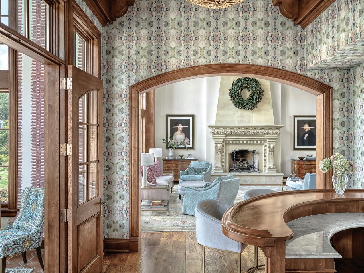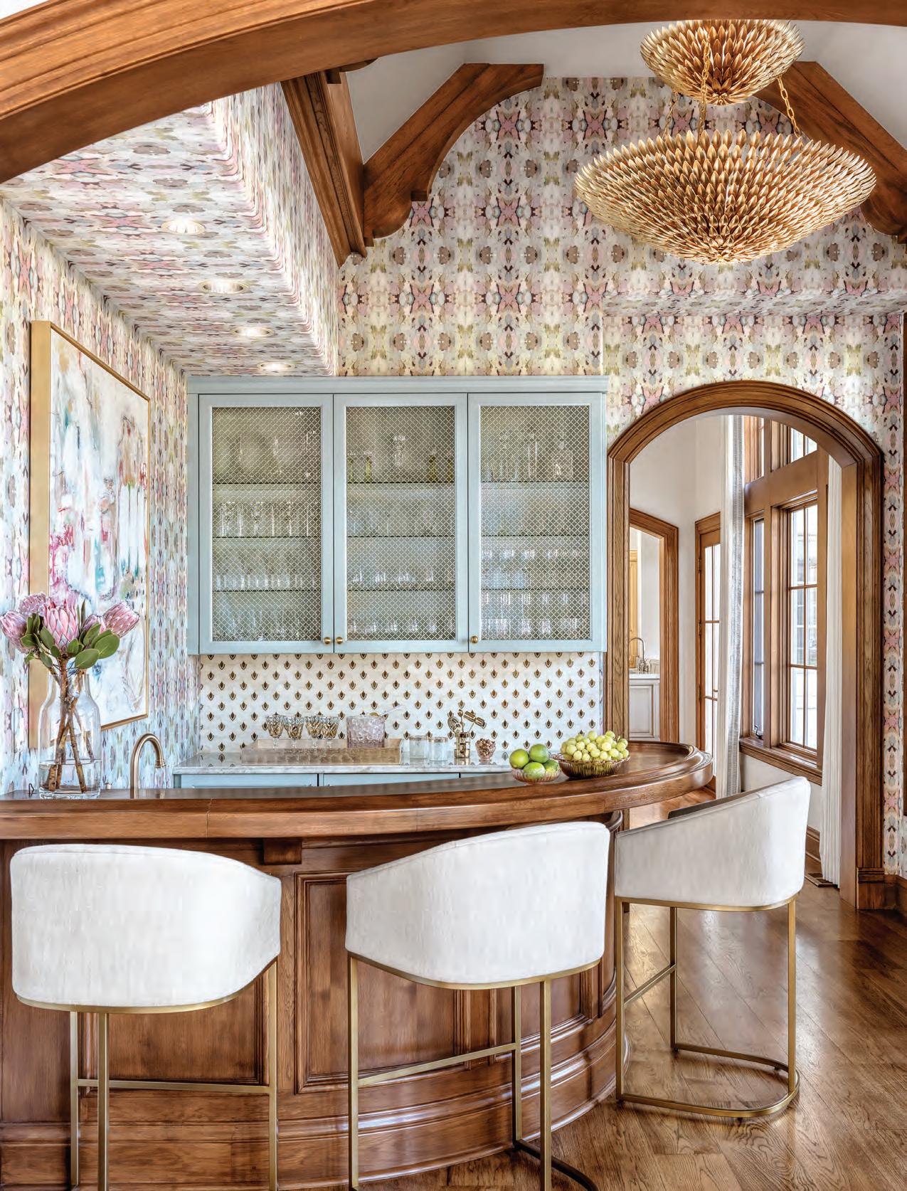 “It ’s where I often spend my evenings curled up in a chair with a book, listening to the gentle busyness of the house,” she said. “From there, I can see up the stairs to my children’s bedrooms and into the kitchen and sunroom. I love taking in the beauty of the great room while feeling connected to everything happening throughout the rest of the home.” The great room’s subtle elements flow into the wet bar, where the patterns are a bit stronger.
