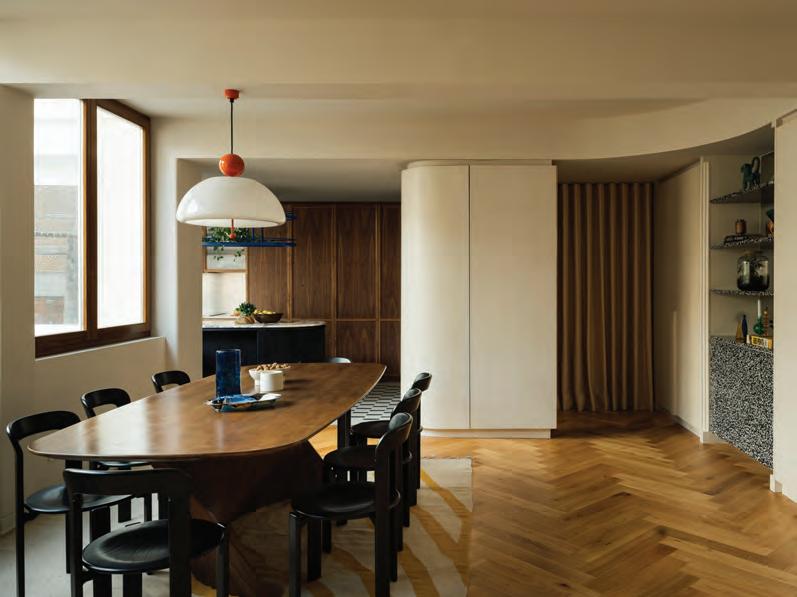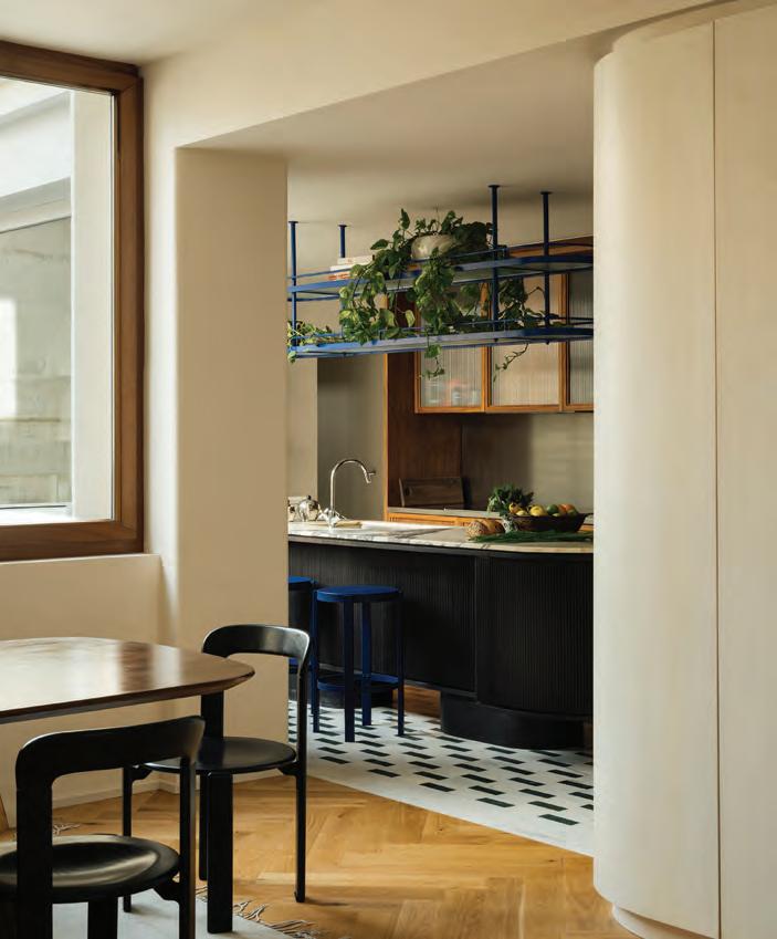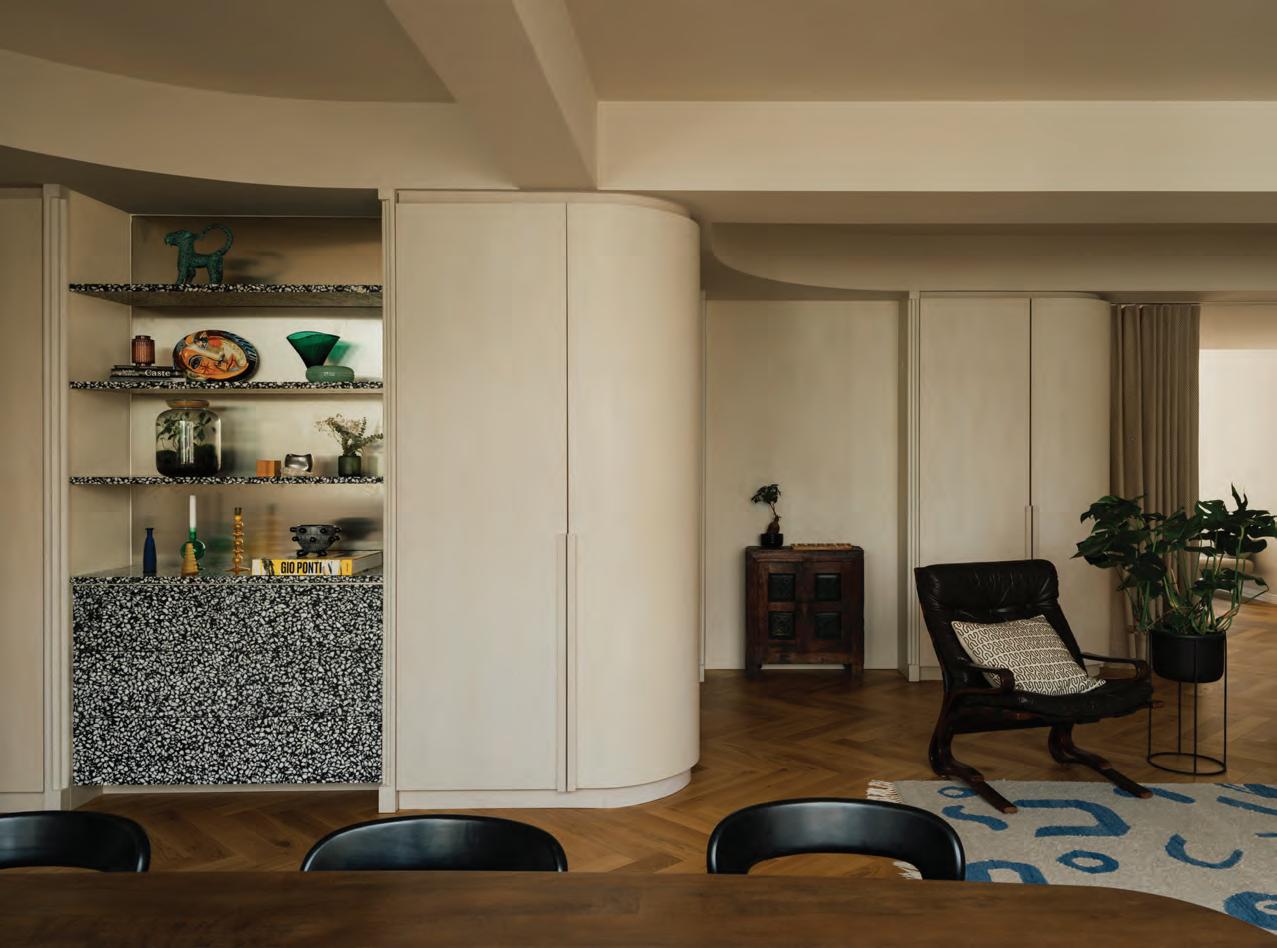 Another highlight—the built-in shelving design—makes its own statement about the unity of the home’s history and transformation. Art Deco-inspired shapes and colors harmonize with raw aluminum and dark terrazzo, creating a storage space that is both functional and appealing. Such a design is made to store and display memories, history and representation of both new and old.