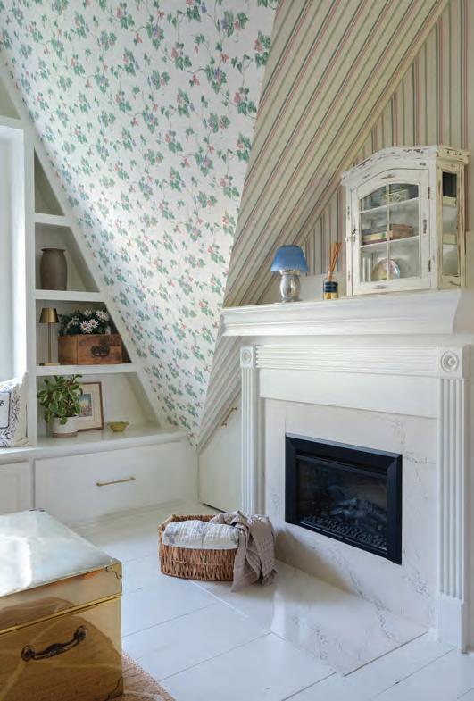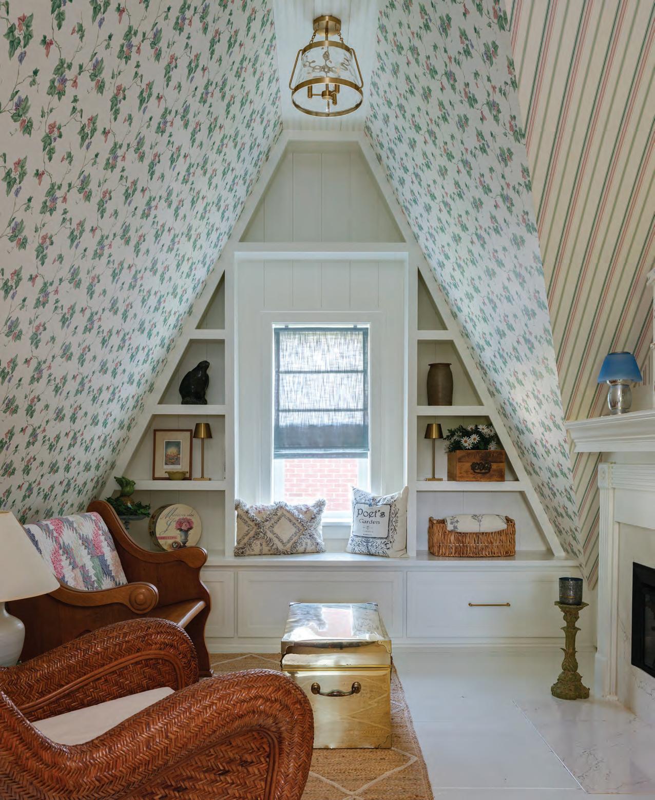 After waiting 20 years, the owner knew she wanted built-ins along the steeply angled walls and hoped to preserve the delicate wallpaper that had adorned the space for more than 30 years. At the start of the design process, two different patterned wallpapers were paired with a floral border, causing the room to feel as though it was competing with itself. Because the wallpaper was in such pristine condition, designer Erin Fleher with Liston Design Build suggested covering the border with white wooden trim to soften the visual busyness while continuing to highlight the history hanging on the walls.