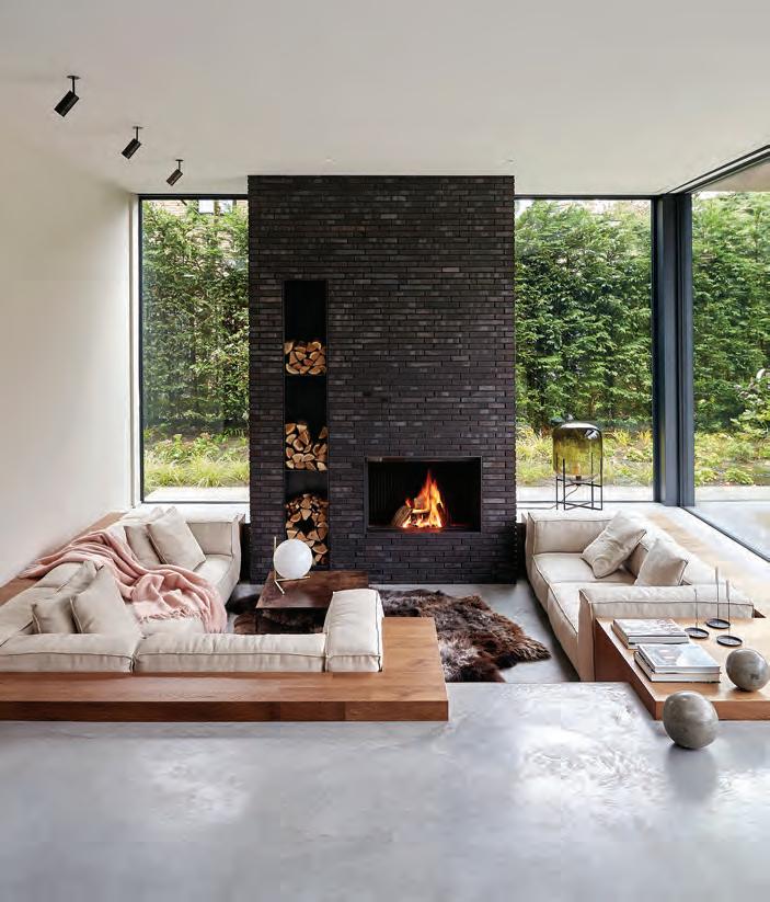 The sunken conversation pit forms an intimate gathering space within the home’s open plan. The family area and fireplace offer a grounded vantage point that contrasts with the soaring doubleheight kitchen. By subtly shifting elevations on an otherwise flat site, the design creates a sense of spatial variety while maintaining openness and connection to surrounding nature. Photography by Kasia Gatkowska.