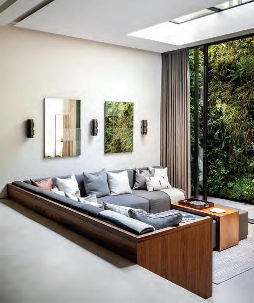 This sunken living area includes a bespoke perfectly sized corner sofa designed by Echlin in cayenne velvet. It rests in a home declared as the epitome of ‘broken-plan’ living with small alcoves, different seating areas, places to rest or hide away but also feel connected. Photography by Taran Wilkhu.