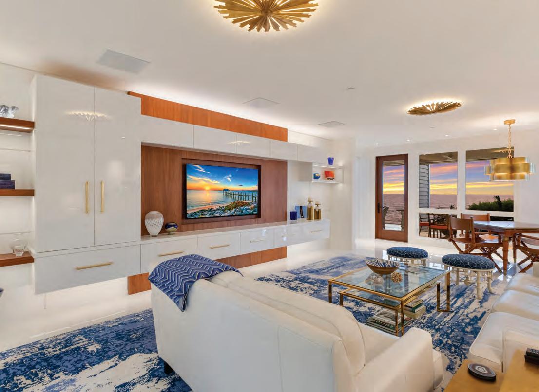 In the family room, a new, built-in entertainment center nods to midcentury modern styling, complemented with new lighting and new furnishings. A blue and white area rug mirrors the hues of the water just steps away.