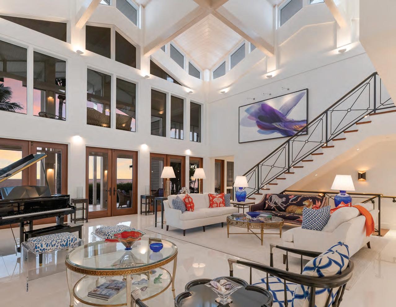 Lighting was also meticulously designed in the great room. “Wilson Lighting in Naples sent three designers, and they spent hours here drawing up plans,” says the owner. “A room with such a tall ceiling is tough to get right.”