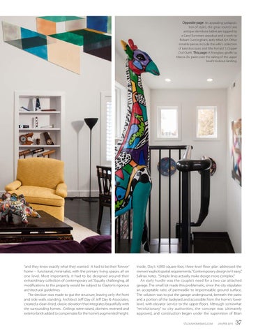 Inside, Day’s 4,000-square-foot, three-level floor plan addressed the owners’ explicit spatial requirements. “Contemporary design isn’t easy,” Salinas notes. “Simple lines actually make design more complex.” An early hurdle was the couple’s need for a two-car attached garage. The small lot made this problematic, since the city stipulates an acceptable ratio of permeable to impermeable ground surface. The solution was to put the garage underground, beneath the patio and a portion of the backyard and accessible from the home’s lower level, with elevator service to the upper floors. Although somewhat “revolutionary” to city authorities, the concept was ultimately approved, and construction began under the supervision of Brian STLOUISHOMESMAG.COM