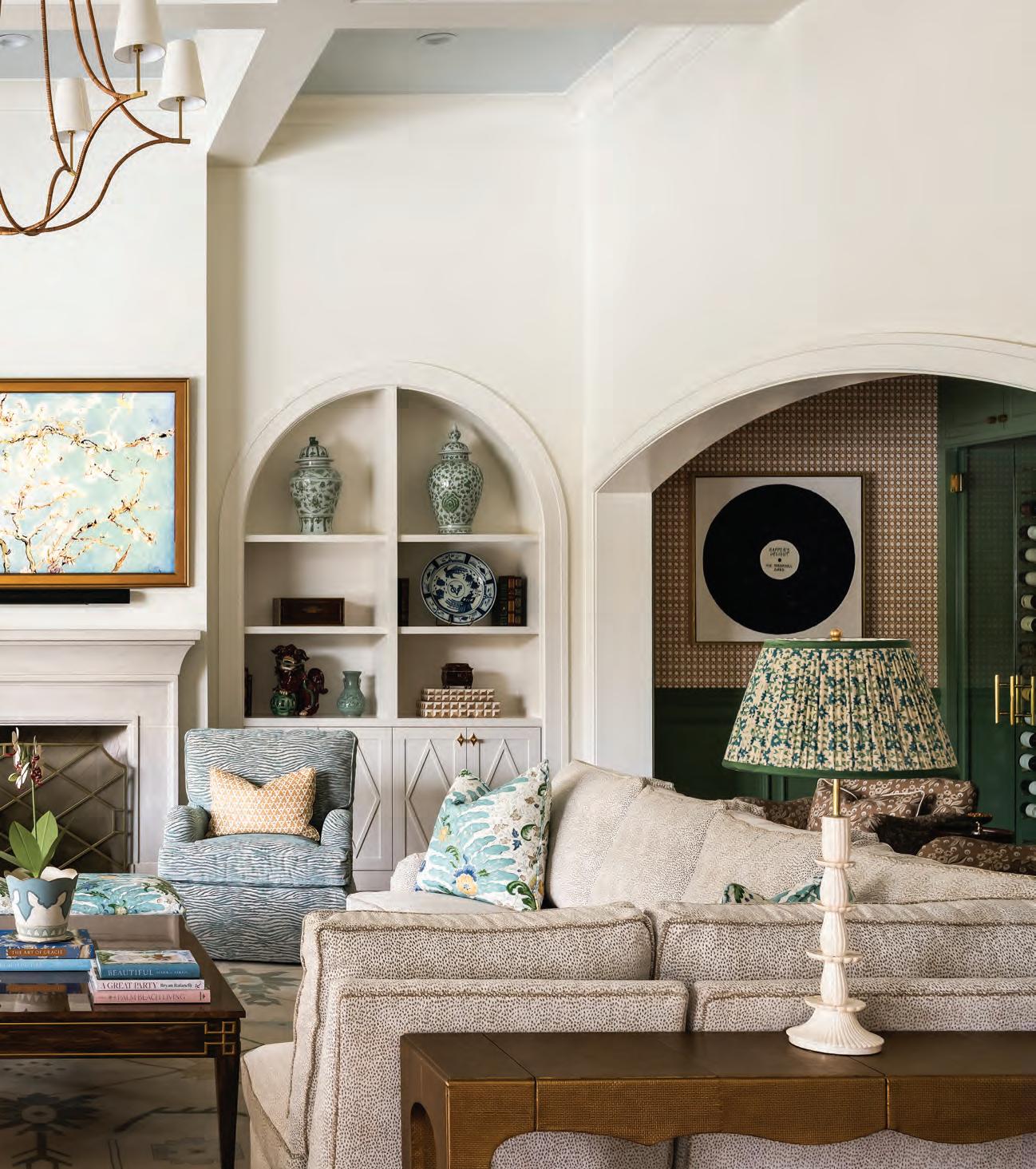 The great room’s deeply detailed ceiling features a touch of blue, adding contrast to the custom millwork. A split sectional provides maximum seating for large-scale family entertaining while still feeling open. Gold console tables from Villa & House and bone inlay lamps with patterned pleated shades flank the seating area. Built-in shelving houses porcelain pieces and other cherished family collectibles.