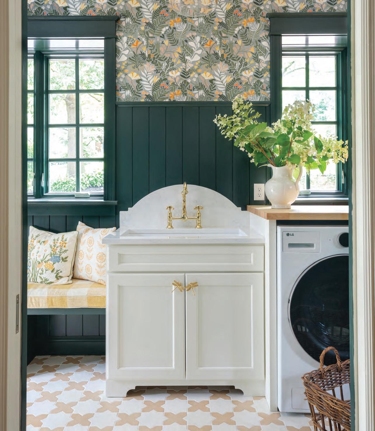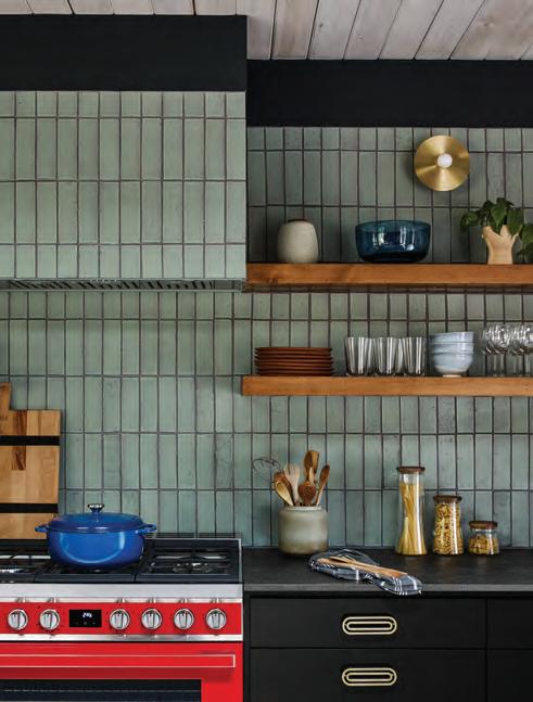 Wise Design helped transform a 100-squarefoot kitchen from its 1960s renovation to a period appropriate design with modern conveniences. Changes included a new opening from the dining room to the kitchen as well as a stunning handmade tile (inspired by an AI-generated image for a life imitating art moment) by Tempest Tileworks. Custom cabinetry including vent holes, paneling for appliances, beadboard and peg rails by George Ramos Woodworking. Photography by Seppi Reda.