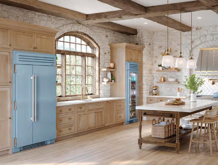 Stainless steel kitchen appliances continue to be the dominant finish, Chris says, but the most popular trends right now are in customizable options. In addition to Wolf’s optional hardware finishes to accent the kitchen, they now offer black or white range doors to bring it all together. KitchenAid and Cafe appliances come in several different colors, with the option of changing knob and handle finishes, which have been very popular and are a bit more budget friendly. True offers many standard refrigeration color options as well as custom color matching,