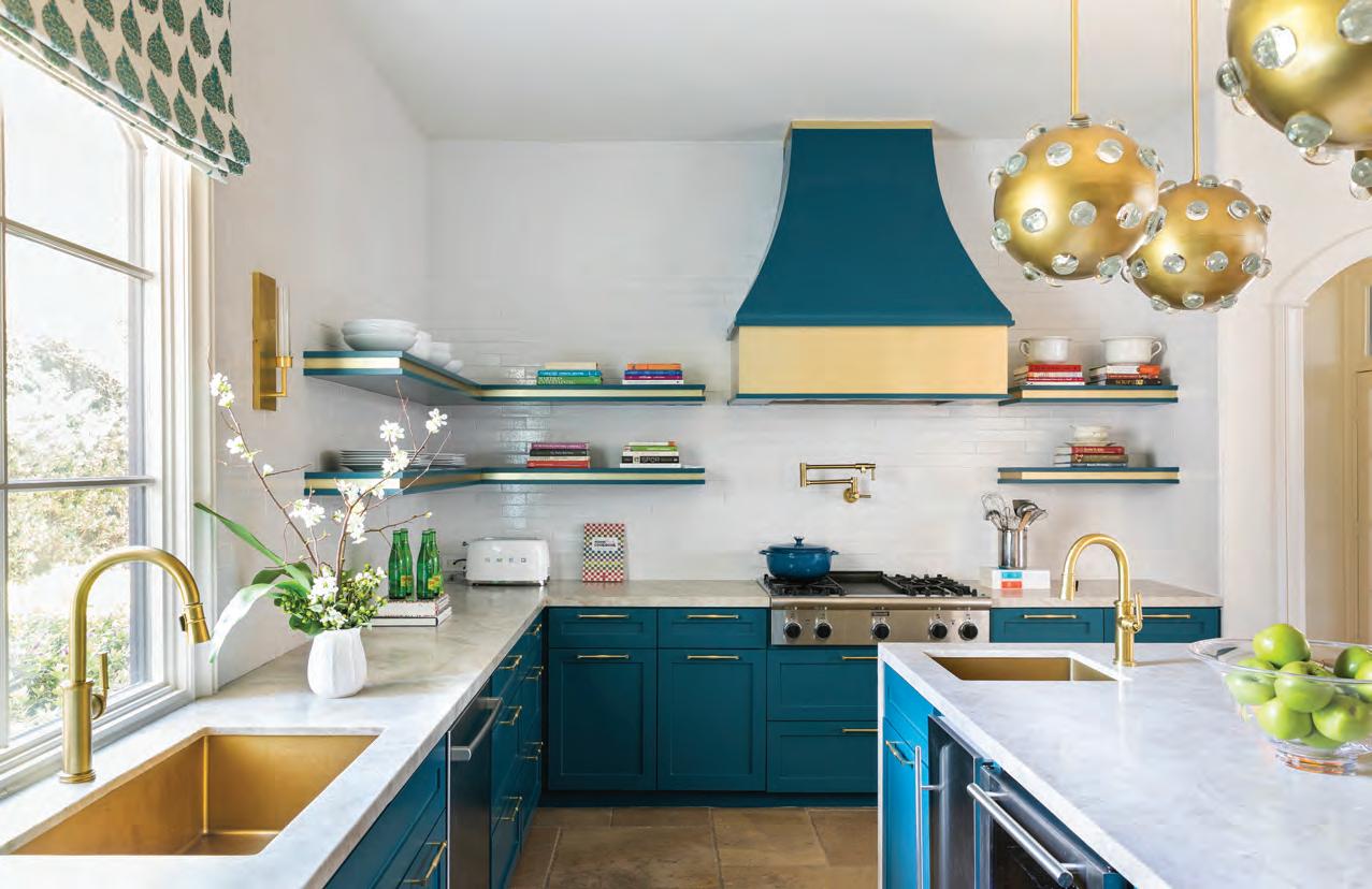 After a fire wiped out the client’s beloved French-inspired kitchen, the designers brought it back in vivid color as a peacock-blue and brass paradise, topped with five gobstopper-style pendants. From the shimmering bistro tile climbing counter to ceiling, and the brass-trimmed custom open shelves and vent hood, to the gleaming gold sinks, every detail was designed to bring joy, with a little French inspiration, back from the ashes! Photography by Julie Soefer.