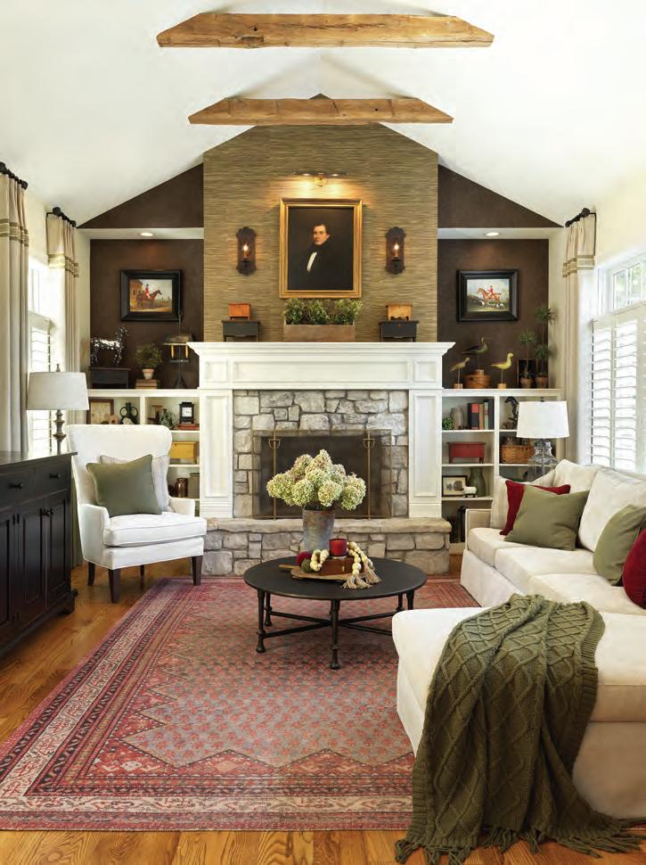 In the hearth room, new furnishings, wallcoverings, custom draperies and layers of texture bring personality to the space. A cozy sectional, patterned rug and green grass cloth and brown leathery wallpaper complement the room’s stone fireplace, and decorative wood beams the homeowners installed prior to the remodel stretch across the ceiling. “The wallpaper and furnishings brought a whole new feel which really elevated the formality of the space,” the homeowners mention. This sense of warmth was carried into the kitchen, where a custom stone hood acts as the room’s focal point and seamlessly blends with the adjoining hearth room’s fireplace. The wooden details at the bottom of the hood and in the hearth room’s beams have an extra sentimental touch as they came from the homeowner’s grandfather’s barn.