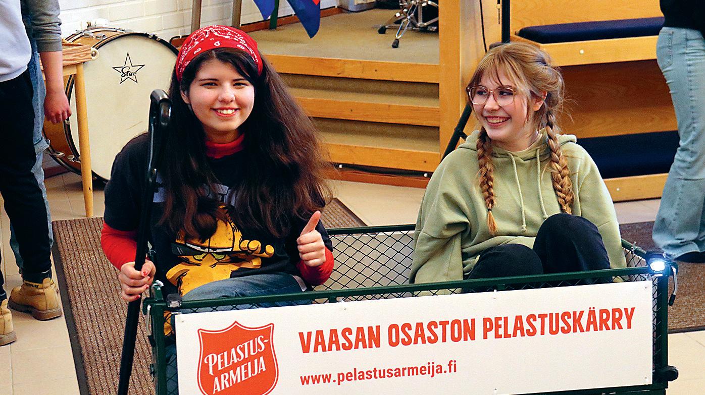 Yllä vasemmalla: Vaasan osaston johtajille, luutnanteille Eija ja Ari Kulmalalle nuorisotyö on aina ollut sydämen asia. Luutnanttien edessä pelastuskärry. Välillä nuorten illan jälkeen luutnantit ja vanhemmat nuoret ovat jalkautuneet kadulle mukanaan kärry ja siellä termareissa juotavaa.