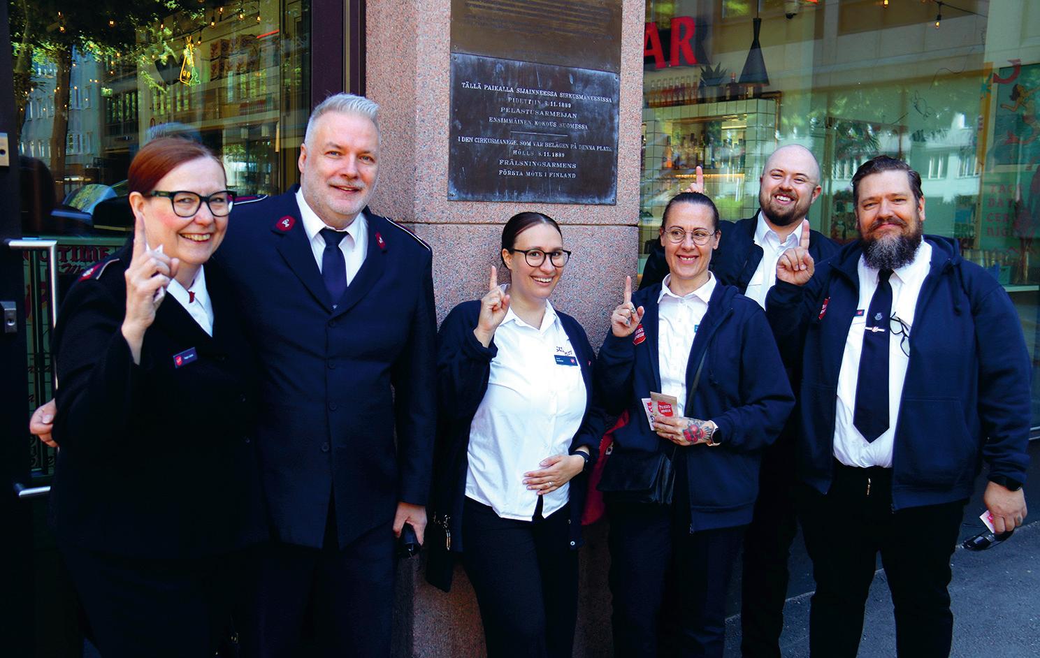 Territorion johtajat, everstiluutnantit Saga Lippo ja Esa Nenonen upseerien kera muistolaatan luona. Paikalla pidettiin Suomen Pelastusarmeijan ensimmäinen kokous 8.11.1889.