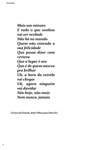 Mais um minuto E tudo o que sonhou vai ser verdade Não há no mundo Quem não entenda a sua felicidade Que possa dizer com certeza Que o lugar é seu Que é de quem nasceu pra brilhar Uh, a hora da estrela vai chegar Uh, agora ninguém vai duvidar Não hoje, não mais Nem nunca, jamais