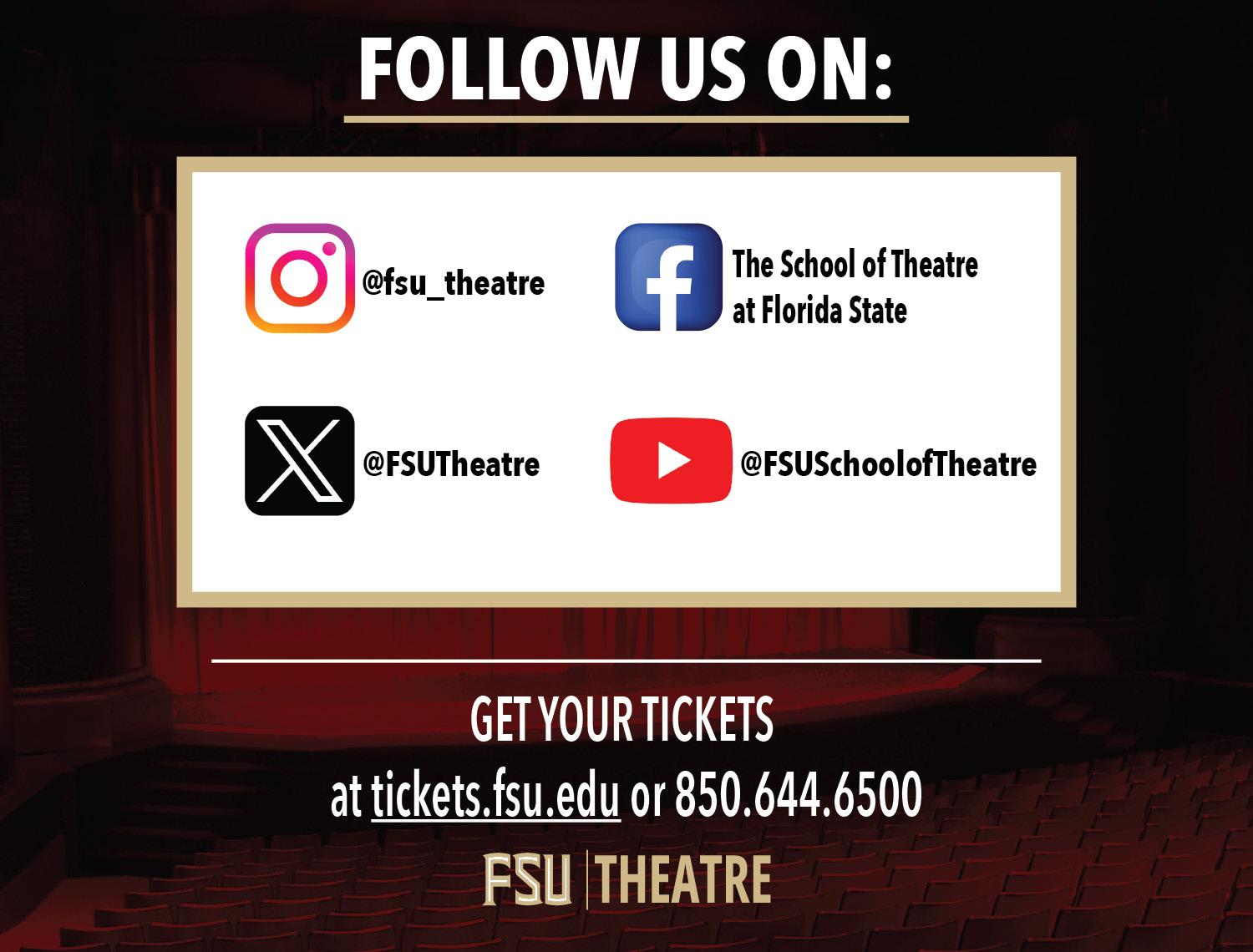 We hope that you will join us for each and every production as we celebrate the incredibly talented students, faculty, and staff who have worked tirelessly to create what you see on stage. Thank you for supporting the arts and the School of Theatre at Florida State as we could not do it without you!