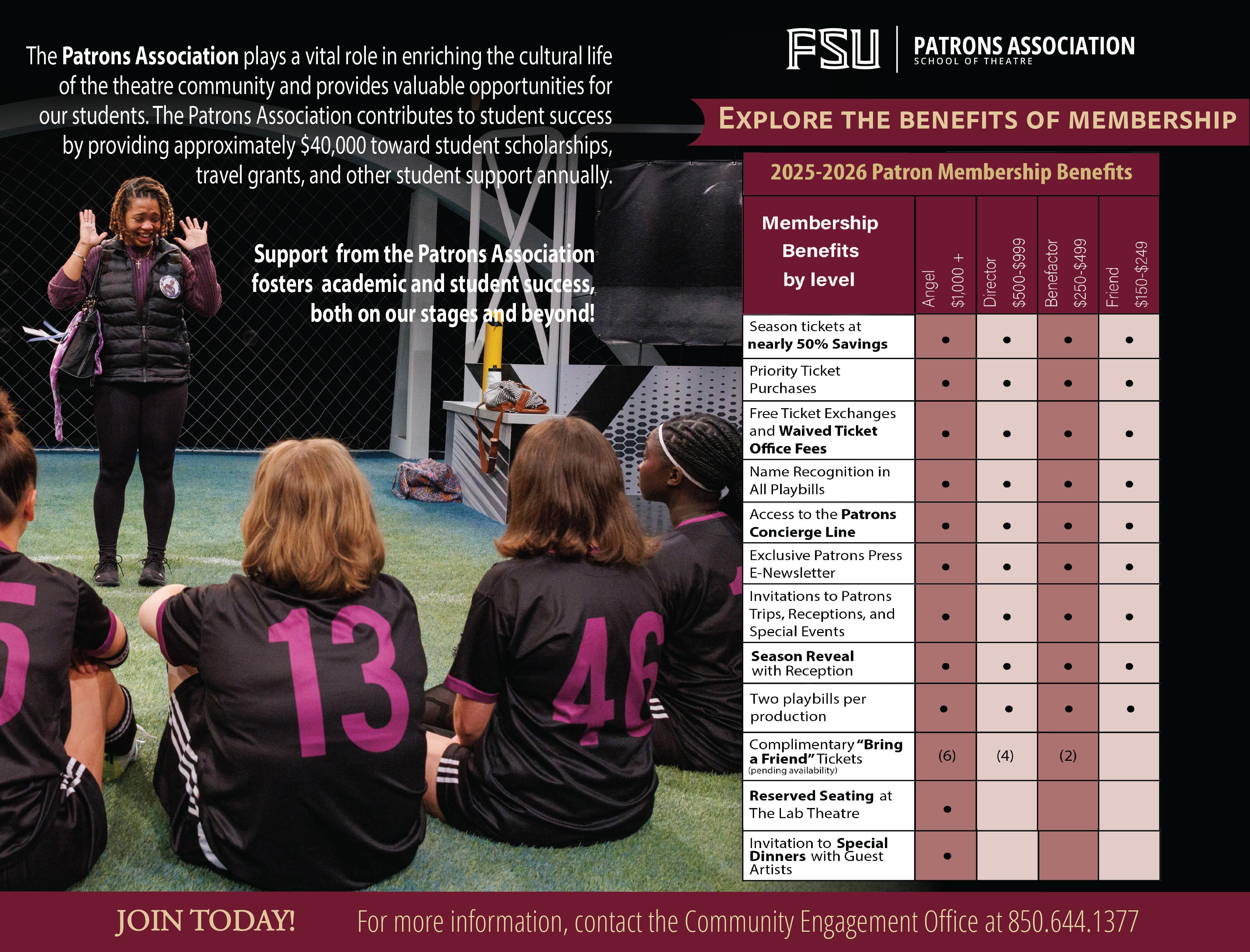 Printed playbills are a benefit of joining the Patrons Association. For more information, visit theatre.fsu.edu/participate/patrons-association/
