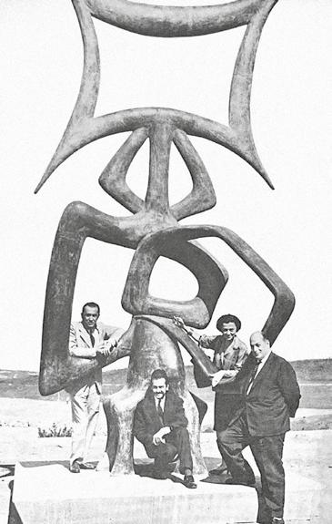 Le président du Brésil Juscelino Kubitschek, Georges Mathieu, Niomar Moniz Sodré Bittencourt et le comte d’Arquian devant l’œuvre sculptée de Maria Martins, symbole de Brasília