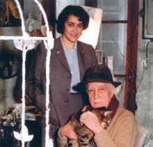 Diego Giacometti, dans son atelier de la rue du Moulin-Vert, avec sa chatte Pita blottie dans ses bras, sous le regard complice de Caroline Pigozzi