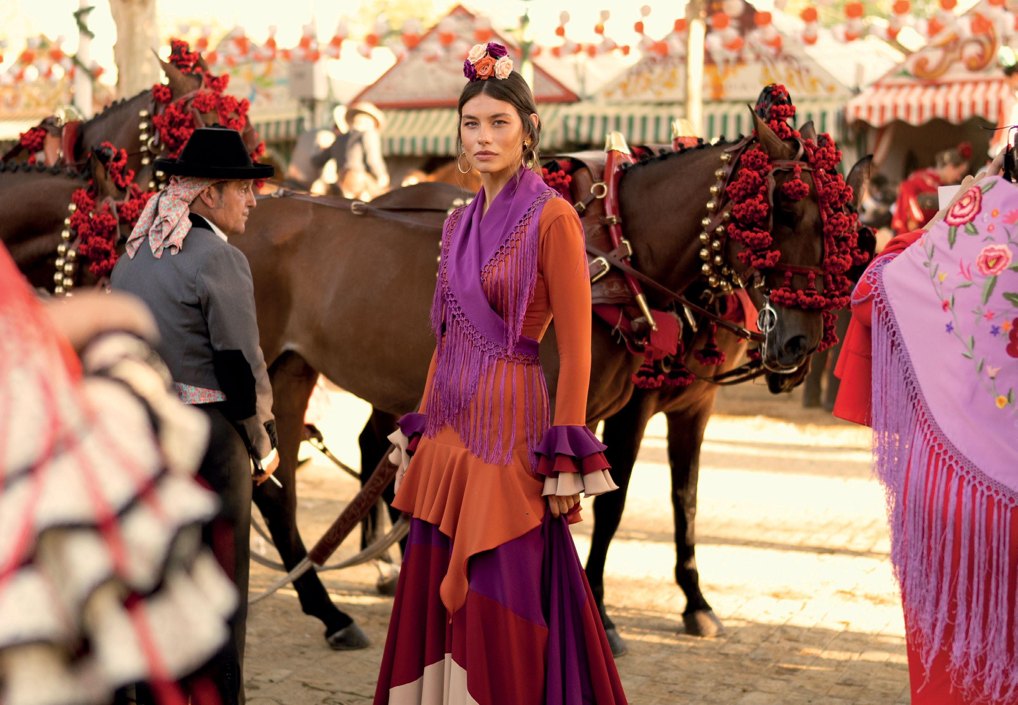 This is a weeklong celebration of music, food, drink and of course fashion. Women usually wear ‘trajes de gitanas’ or gipsy-style flamenco dresses, with fitted bodices that run down to voluminous, tiered, and ruffled skirts. At first glance these vibrant dresses may appear traditional, yet if one looks at little closer, one sees that often the intricate designs are contemporary flourishes of fashionable creativity by local and national designers. Seville designer Rocío Peralta is particularly renowned for her ‘flamenco’ fashion. Loved by locals and international celebrities alike, Rocío’s unique dresses and shawls not only capture the authentic spirit and cultural significance of timehonoured flamenco dresses but reimagines them with new fabrics, striking colours and contemporary flair.