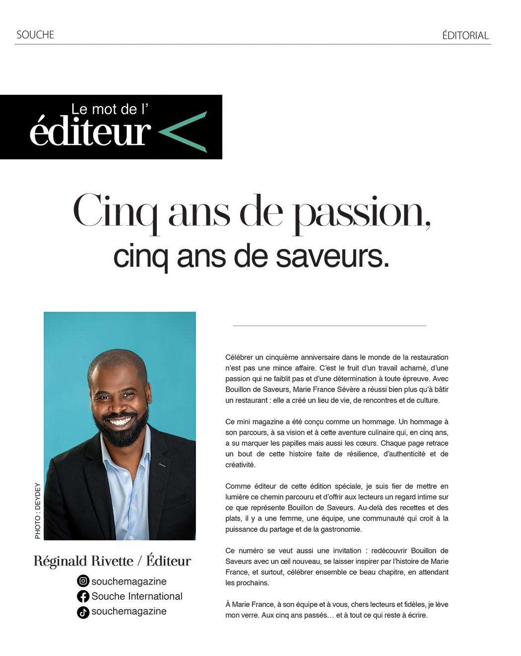 Comme éditeur de cette édition spéciale, je suis fier de mettre en lumière ce chemin parcouru et d’offrir aux lecteurs un regard intime sur ce que représente Bouillon de Saveurs. Au-delà des recettes et des plats, il y a une femme, une équipe, une communauté qui croit à la puissance du partage et de la gastronomie.