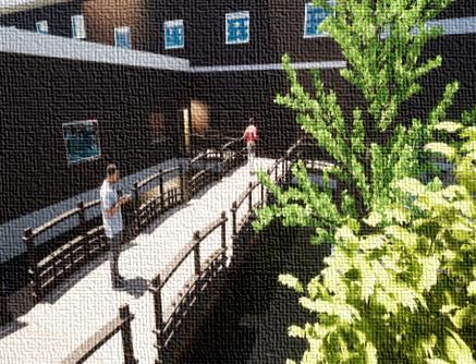 Upon entering the admin block, amidst the planter boxes, there is a reception with a backdrop of a green wall, which decreases the gap between the visitor and the nature. While the guests are checked in, there is a waiting area with lush couches and bookshelves to keep the guest busy. The curtain wall provides ample sunlight and a view of small garden right in front of the admi block with a fountain of its own.