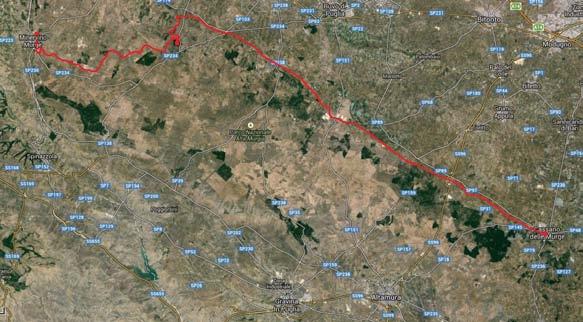 Via in discesa dritti per il sentiero che taglia il bosco lungo la linea di massima pendenza, in direzione nord si segue, poi, un single track immerso nella nautra, che conduce in breve tempo ad un ponte. e' qui che parte, come una cicatrice, la linea dell'acquedotto pugliese, una linea perfetta, un'opera maestosa che porta acqua pura ad una regione intera e da oggi indicherà la strada a runners ed escursionisti! Inclinazione costante di pochi gradi, piccole vallette superate di slancio con viadotti di stile antico, il sistema classico adottato dai Romani per costruire le loro inimitabili vie. Terreno ideale per trovare il “ritmo” giusto e dimenticare a casa tensioni, stress e lavoro, per concedersi un attimo lungo 50 chilometri per se stessi. una serie infinita di colline, muretti a secco, uliveti e pascoli che conducono d'un sol fiato a Cassano delle Murge interrotti solo da qualche incrocio con le provinciali e qualche cancellata da aggirare con un minimo di spirito di avventura ed adattamento che rendono il viaggio Murge By Run unico!