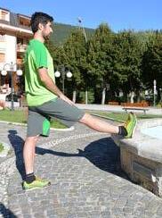 Appoggiare l’avampiede ad un ostacolo, aiutandosi con un piegamento ed una distensione della gamba posteriore. Il ginocchio anteriore rimane completamente esteso.