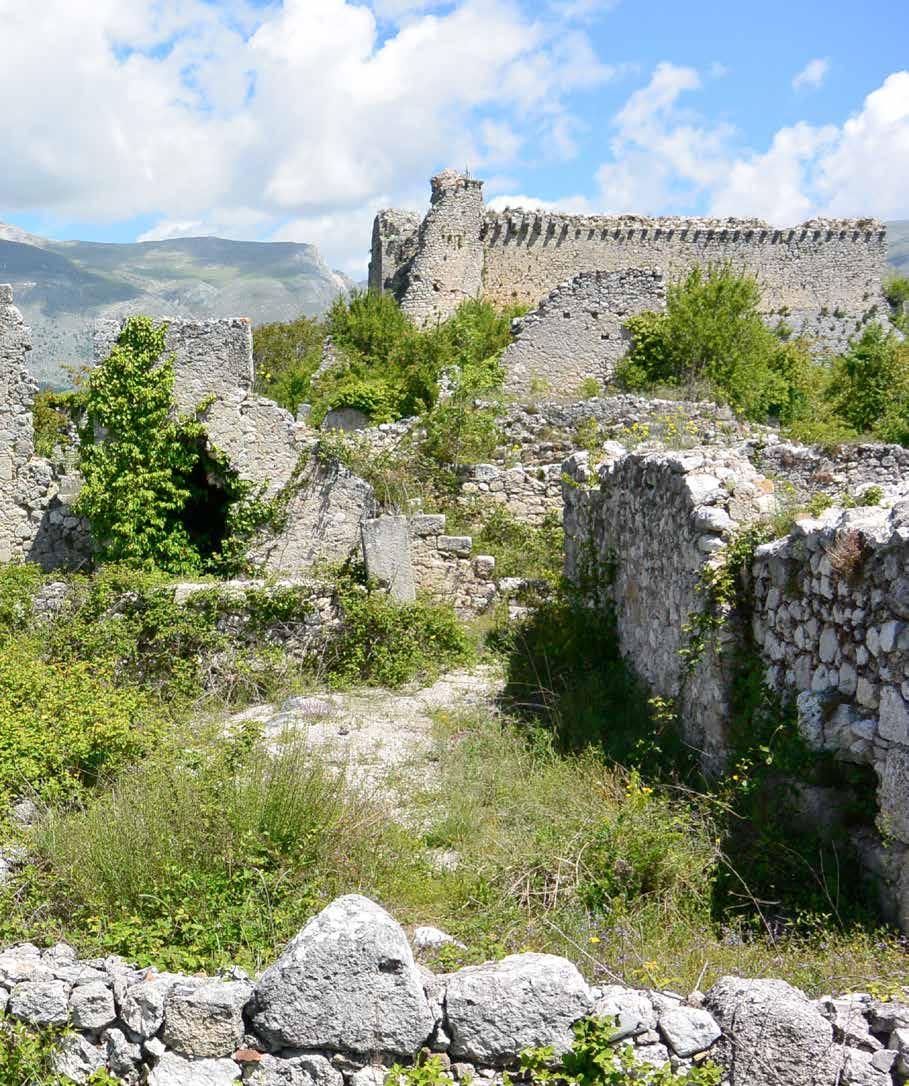 Castel del Monte è un Borgo fortificato di origine medievale a quota 1345 mt, costruito dalle popolazioni che vivevano 300 metri più in basso, nel Piano, una depressione carsica adibita a coltivazioni. Lasciarono le loro abitazioni per difendersi, salendo sulla montagna. Correre tra i vicoli, le scalinate, i muri di pietra bianca di questo borgo, nell’assoluto silenzio, è quasi irreale. Tanto che cerchi di alleggerire il passo, andare sulle punte, per non far rumore. Una forma di rispetto o forse un voler cercare di ascoltare quanta storia ha da raccontare questo luogo.