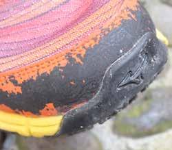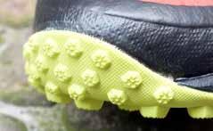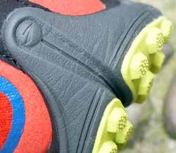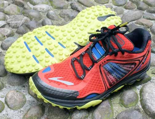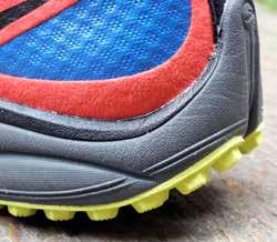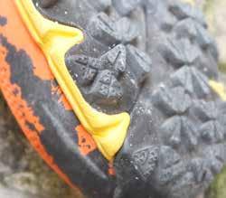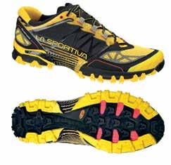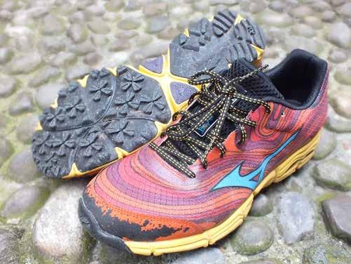 Molto particolare il disegno della suola dotata di tasselli romboidali con un’inclinazione differente, tra parte anteriore e posteriore, per ottimizzare, rispettivamente, trazione e frenata. I tasselli sono molto ravvicinati e tendono a trattenere un po’ il fango, ciononostante il grip è davvero efficace. Buona la sensibilità sul terreno e molto ben ammortizzata sia posteriormente che sull’anteriore. Tiene ben saldo il piede, fasciandolo il giusto, ma lascia comunque un’ottima libertà di movimento per adattare la propria corsa alle variazioni del terreno.