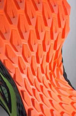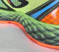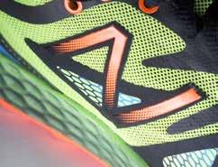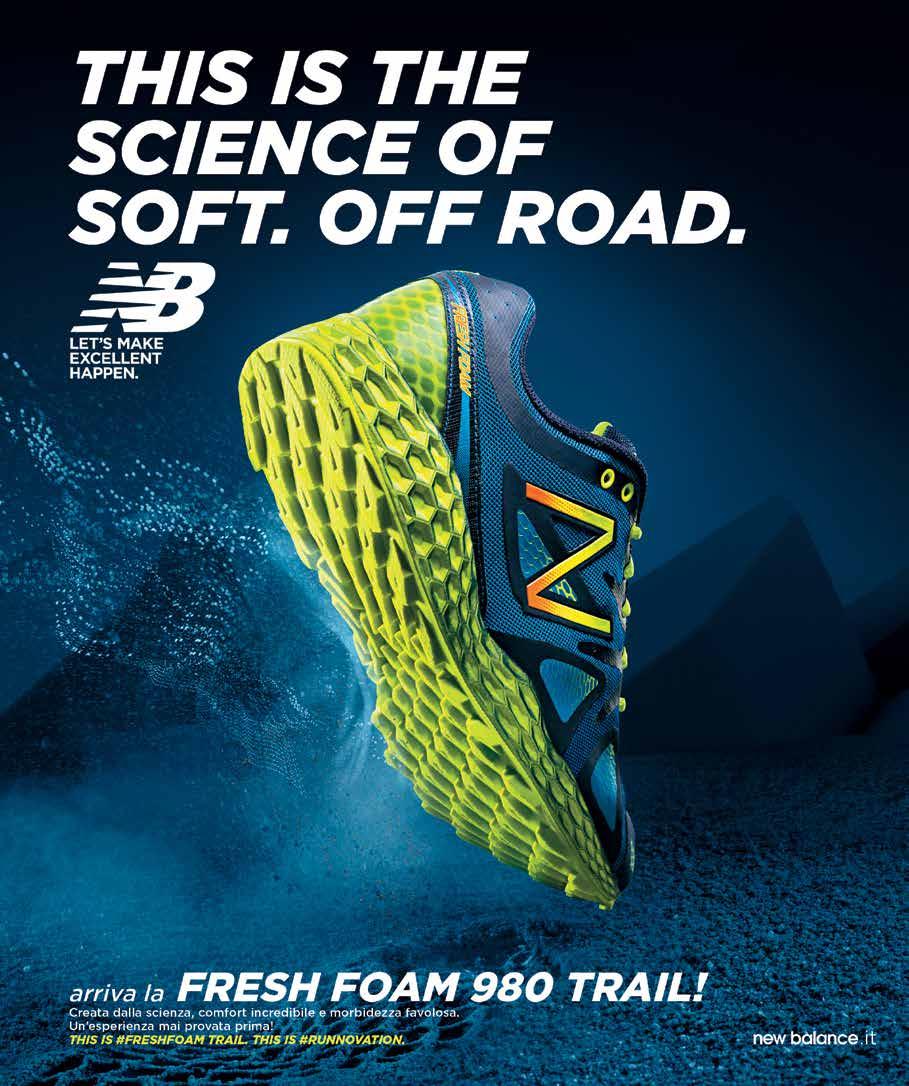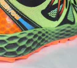 Per il brand di Boston la tecnologia Fresh Foam è la grande novità 2014. Introdotta inizialmente con il modello 980 da strada è stata impiegata anche nella versione trail. Un’intersuola innovativa caratterizzata da una serie di esagoni che, variando nelle loro dimensioni, reagiscono nel modo giusto alle pressioni, differenti nelle varie aree della scarpa. Li troviamo quindi più grossi a livello del tallone e addirittura in rilievo nella parte interna a sostenere il piede. Dove è richiesta maggior flessibilità sono più piccoli e stretti, in questo modo si elimina il materiale dove non serve e lo si concentra dove le sollecitazioni sono maggiori: il risultato è performance e leggerezza. La tomaia è in Air Mesh con rinforzi strutturali in plastica TPU termosaldati oltre a inserti riflettenti per i runner “notturni”. Con il suo differenziale di 4 mm questa 980 è una scarpa molto sensibile e reattiva dotata comunque di una buona ammortizzazione, anche se all’inizio si ha la sensazione che l’appoggio sul tallone abbia una risposta un po’ secca. A livello dell’avampiede l’intersuola ha un profilo che facilita la rullata e soprattutto la spinta.