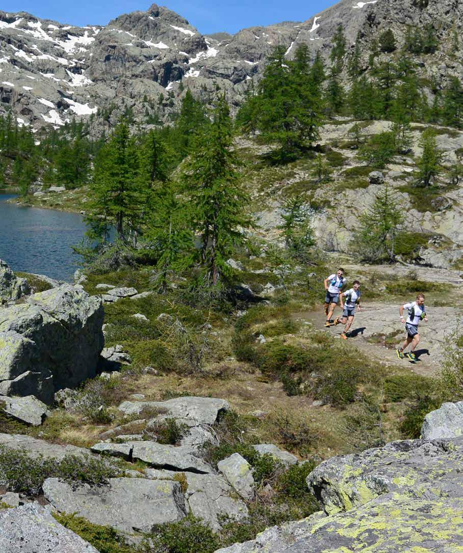 Dennis, il “campiùn” come lo chiama simpaticamente Franco, è il padrone di casa, conosce a memoria tutti i sentieri percorribili dell’intera area del Mont Avic, li ha mappati uno a uno, solo gli animali del Parco sanno muoversi meglio di lui in questo ambiente... forse... Assieme al “Mondo”, un altro amico che ci ha raggiunto, iniziamo la nostra prima giornata di corsa alla scoperta di questa valle e subito ci imbattiamo nell’ex Miniera di Hèrin, attiva fino agli anni ‘50, da cui si estraevano rame, ferro e zolfo. Il rosso delle rocce intorno alla miniera rappresenta un deciso contrasto cromatico rispetto al bosco che si attraversa salendo da Covarey. Da qui in poi il sentiero sale sempre più ripido verso il crinale del monte Barbeston, fino alla sua cima a 2483 mt: nonostante la fatica riusciamo a divertirci fotografandoci a vicenda e raccontando ognuno le proprie esperienze di corsa in montagna. Gli aneddoti più divertenti però sono quelli di Franco e Dennis che ci raccontano delle loro esperienze passate, e dei loro primi approcci con il mondo del trail running.