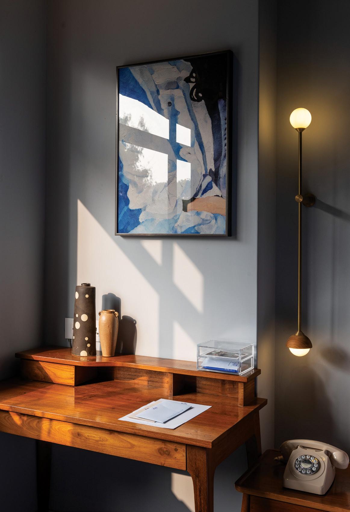 The space abounds in thoughtful details. In the light fixtures, polished brass rods end in a frostedglass bloom and in the bar stool, a tiny metal dragon holds up the footrest. “This was a labour of love,” Mukherji states.