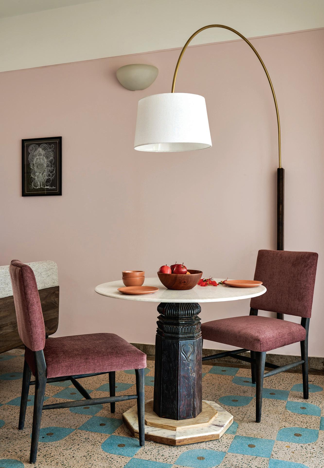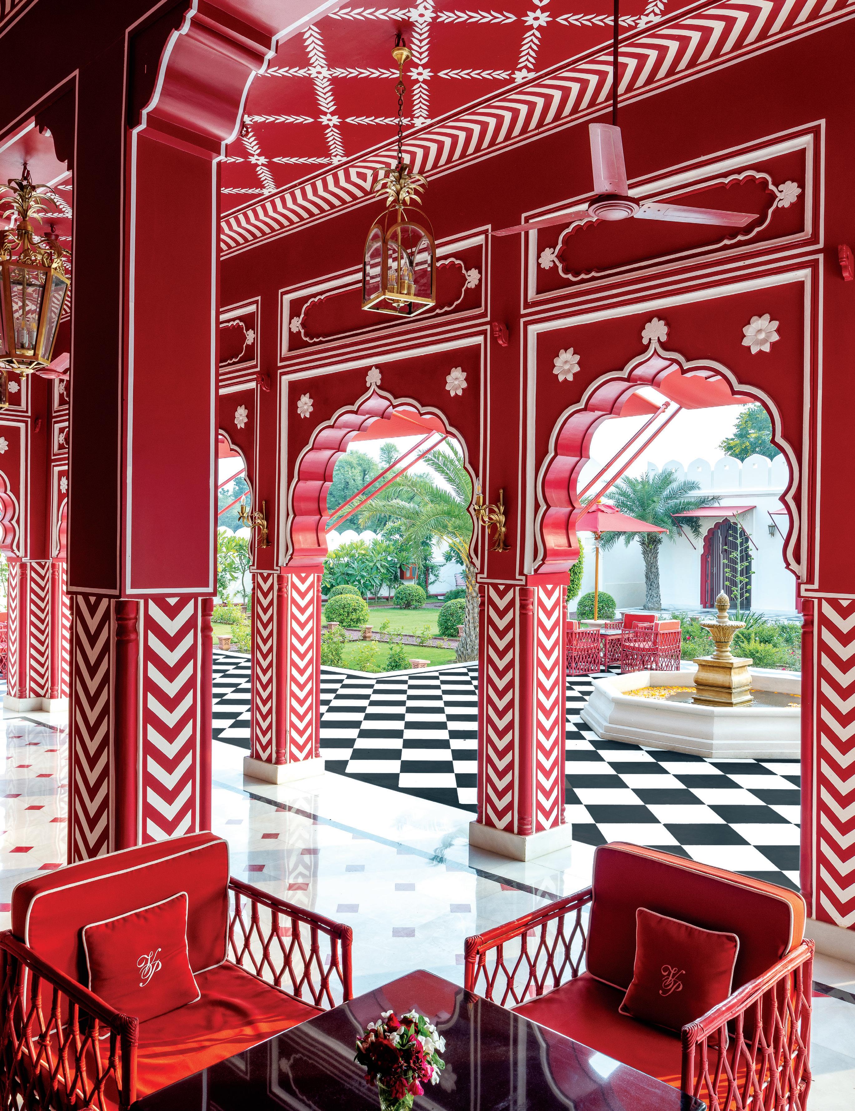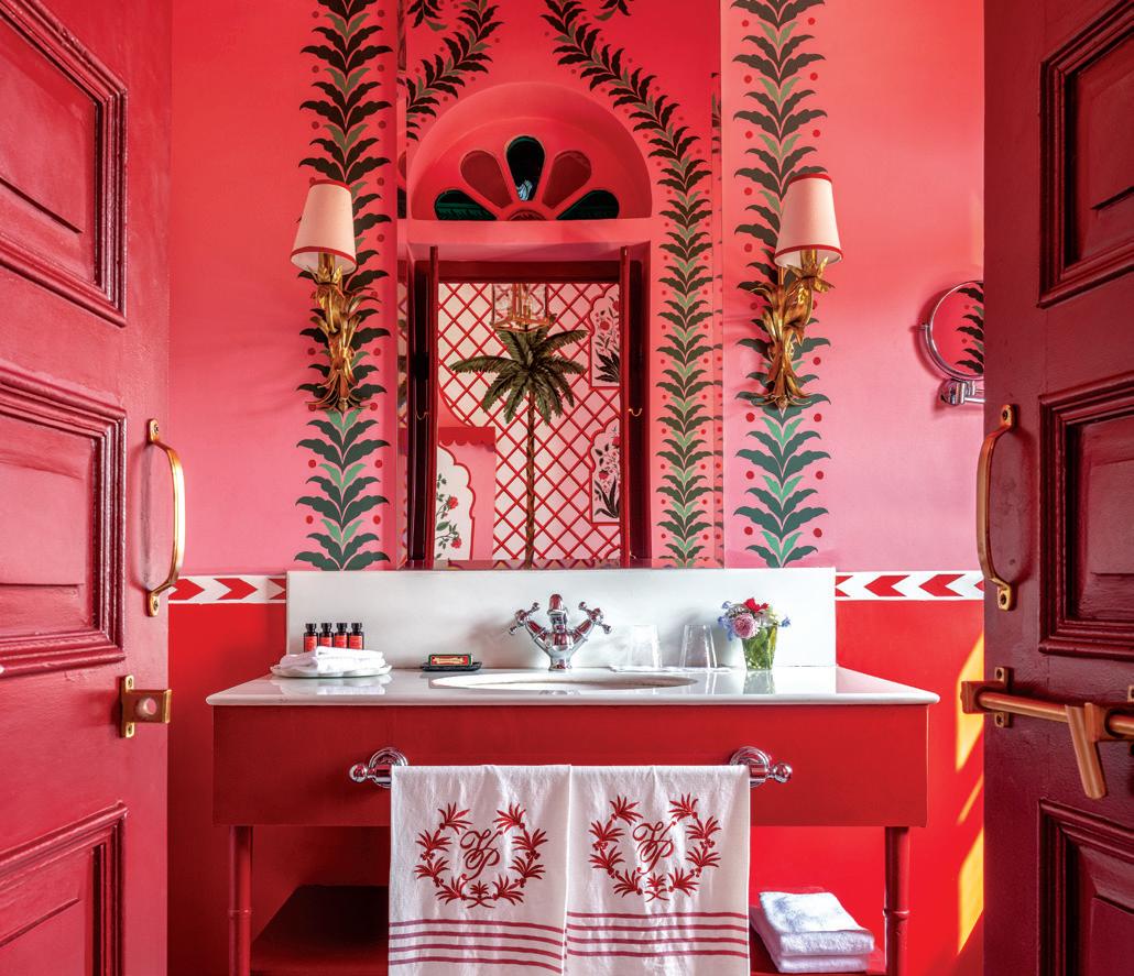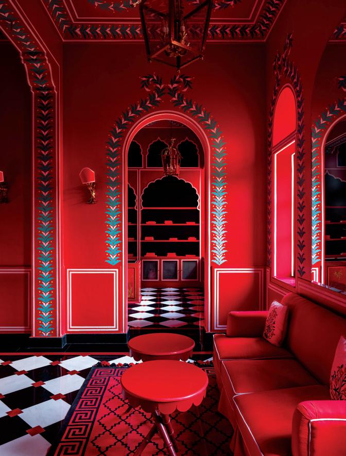 The bathrooms, an extension of the room aesthetics, defy the sleekness trend in modern design, prioritising comfort and cosiness. Marble jaalis for showers and redand-white marble floors ensure continuity. Oudejans and Miolini embraced diverse lighting, avoiding halogens or track lights. Instead, the property is adorned with things such as hanging lanterns, Venetian wall sconces, and delicate table lamps, creating a homely ambience.